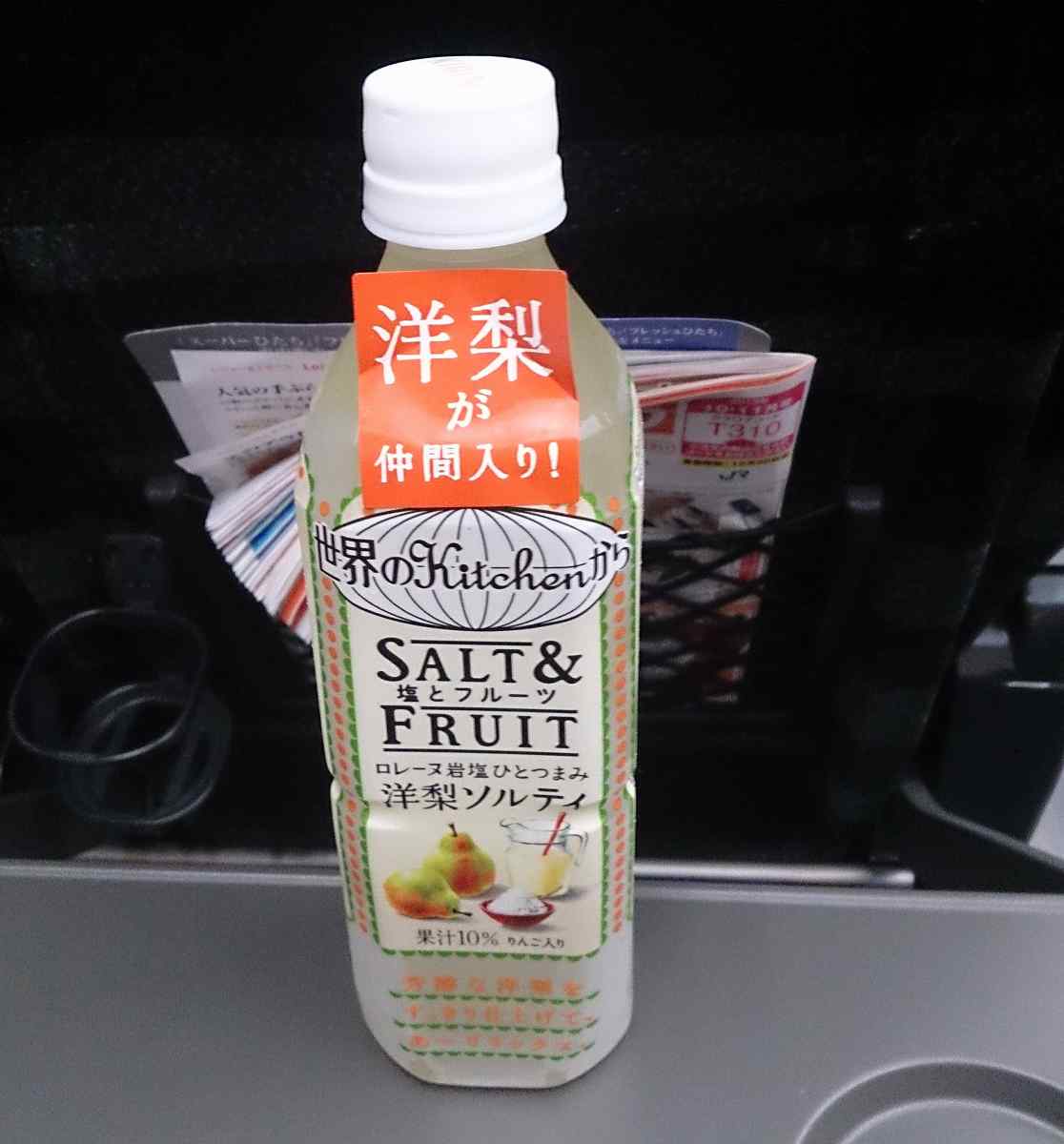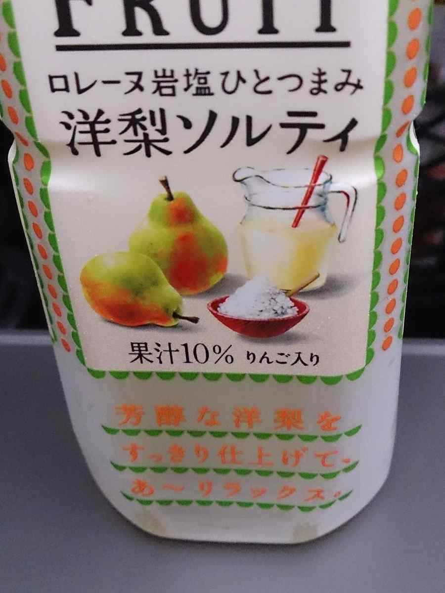今日の飲み物 世界のキッチンから塩とフルーツロレーヌ岩塩ひとつまみ洋梨ソルティは、少々水っぽく果汁感はあまり感じられない物の、運動後に甘いものを飲みたい方にオススメ