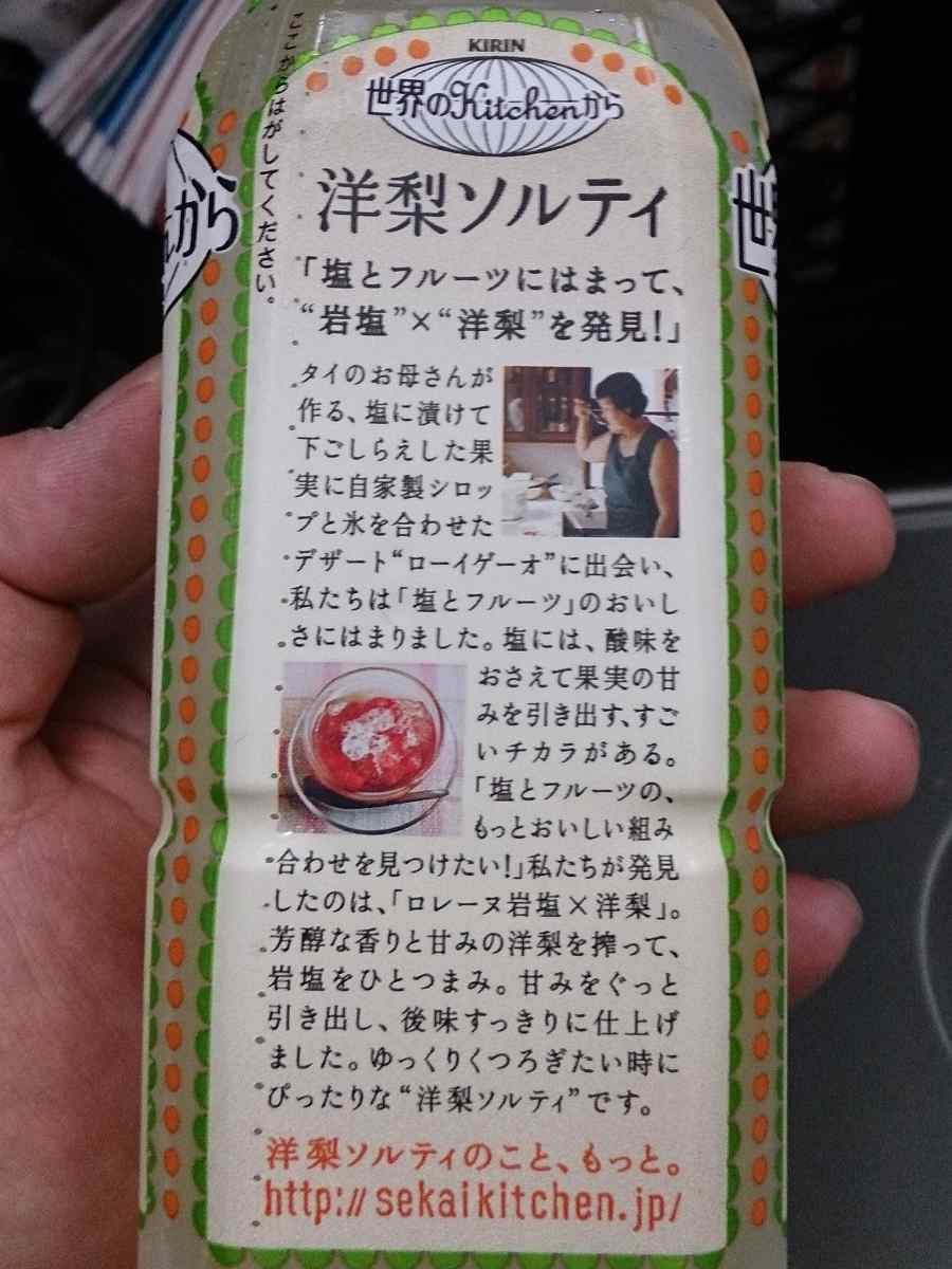 今日の飲み物は、キリンビバレッジ株式会社発売の世界のキッチンから塩とフルーツロレーヌ岩塩ひとつまみ洋梨ソルティ