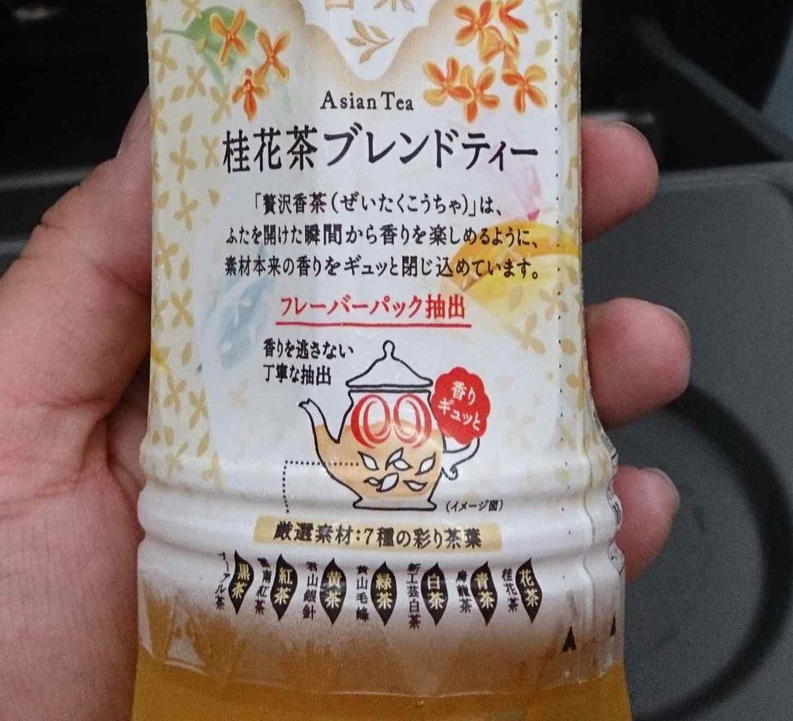今日の飲み物は、ダイドードリンコ株式会社発売の贅沢香茶 Asian Tea 桂花茶ブレンドティー7種類の彩り茶葉使用です。