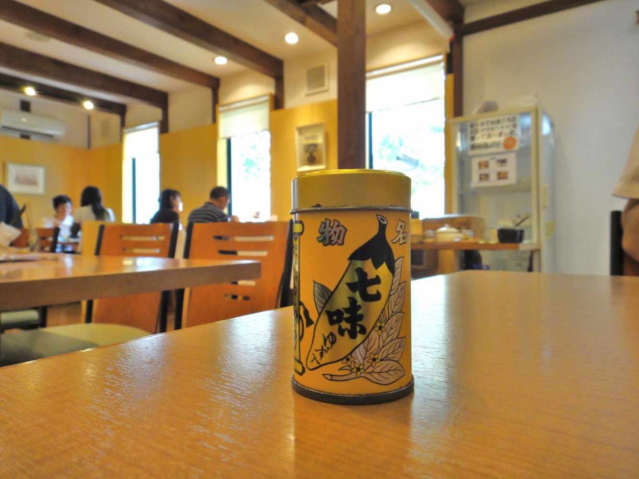 店内に入ると長野県のお店らしく、あの八幡屋礒五郎の七味の缶が席横に置かれていました。