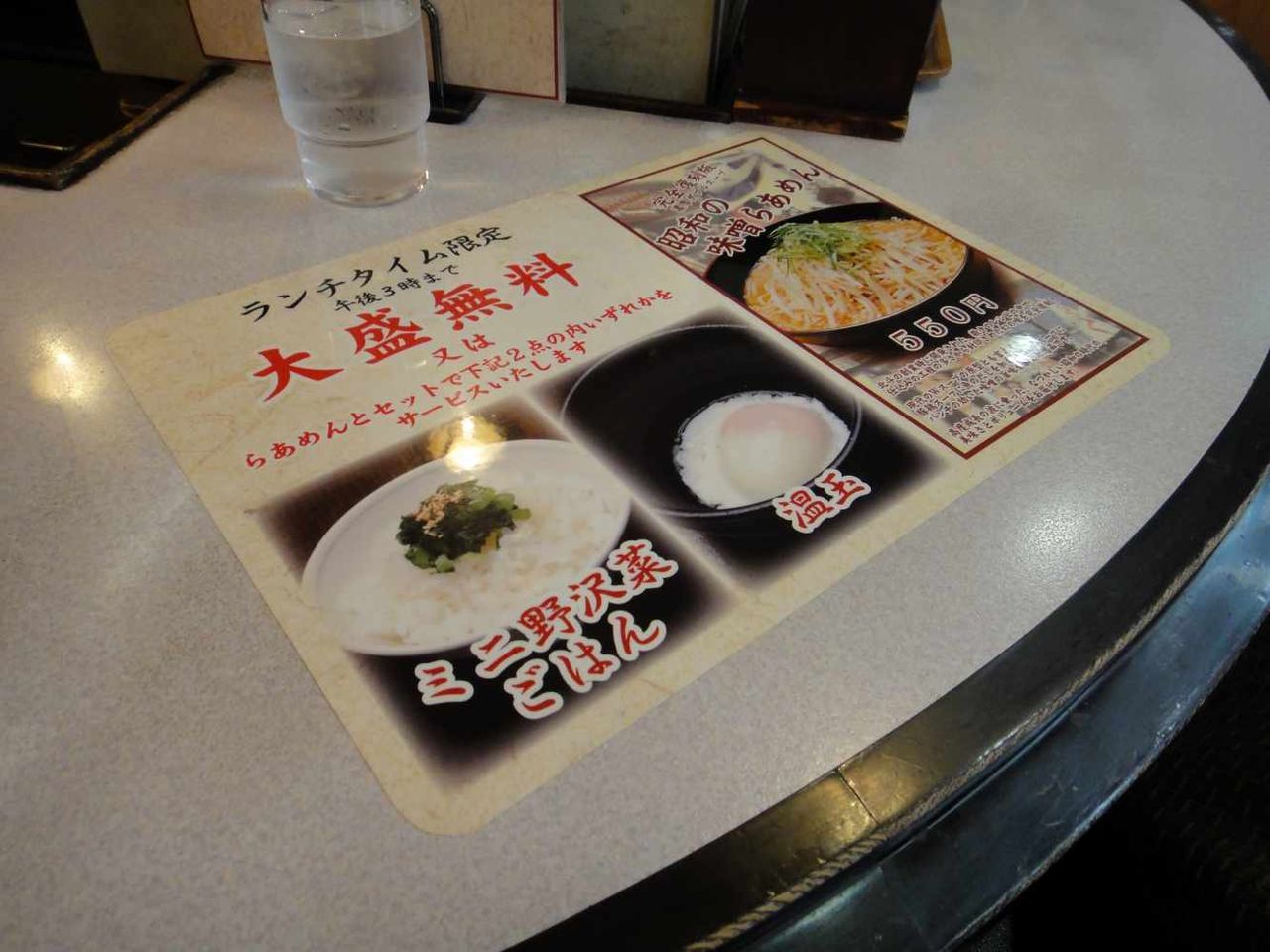 ランチタイムにはラーメン大盛りかミニ野沢菜ご飯、温玉のどれか一つが無料で頂けるので