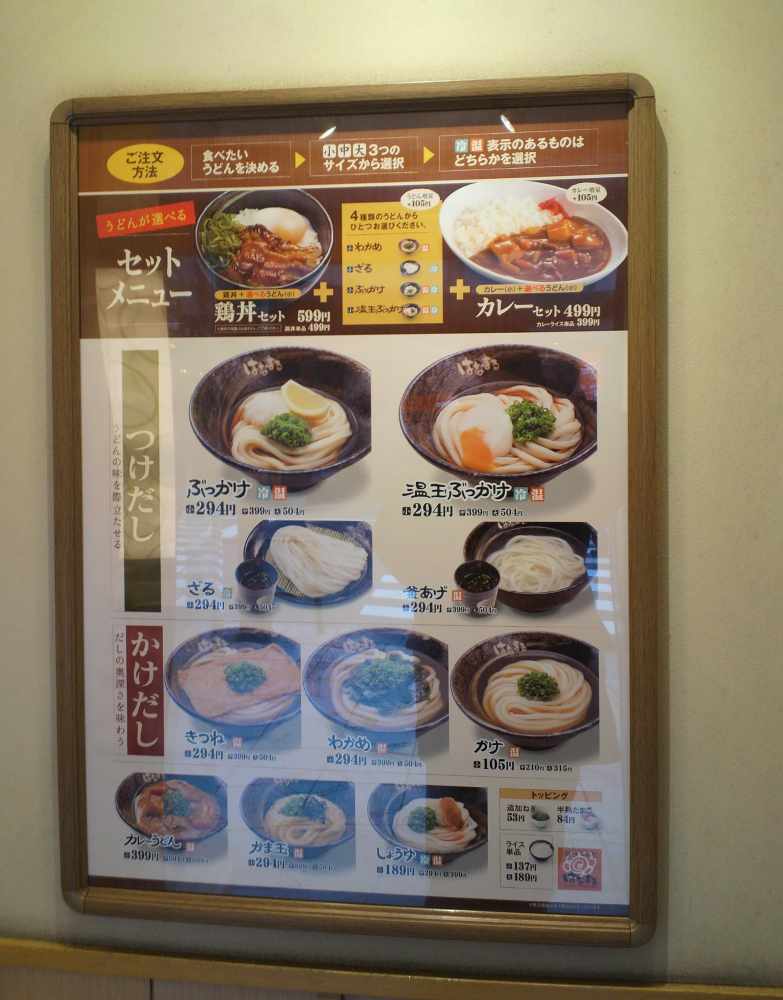 入り口に掛かったメニュー表を見ると、各種うどんやセットメニューの他に