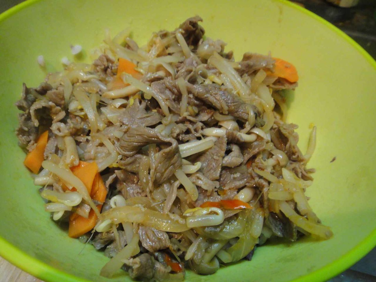 最後に肉を合わせて炒めた後は、醤油やお茶などで味付けをして、甘味のない牛皿を作りましたが