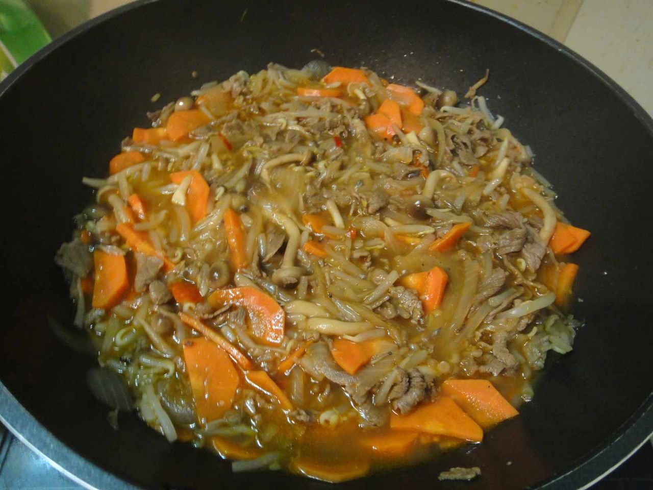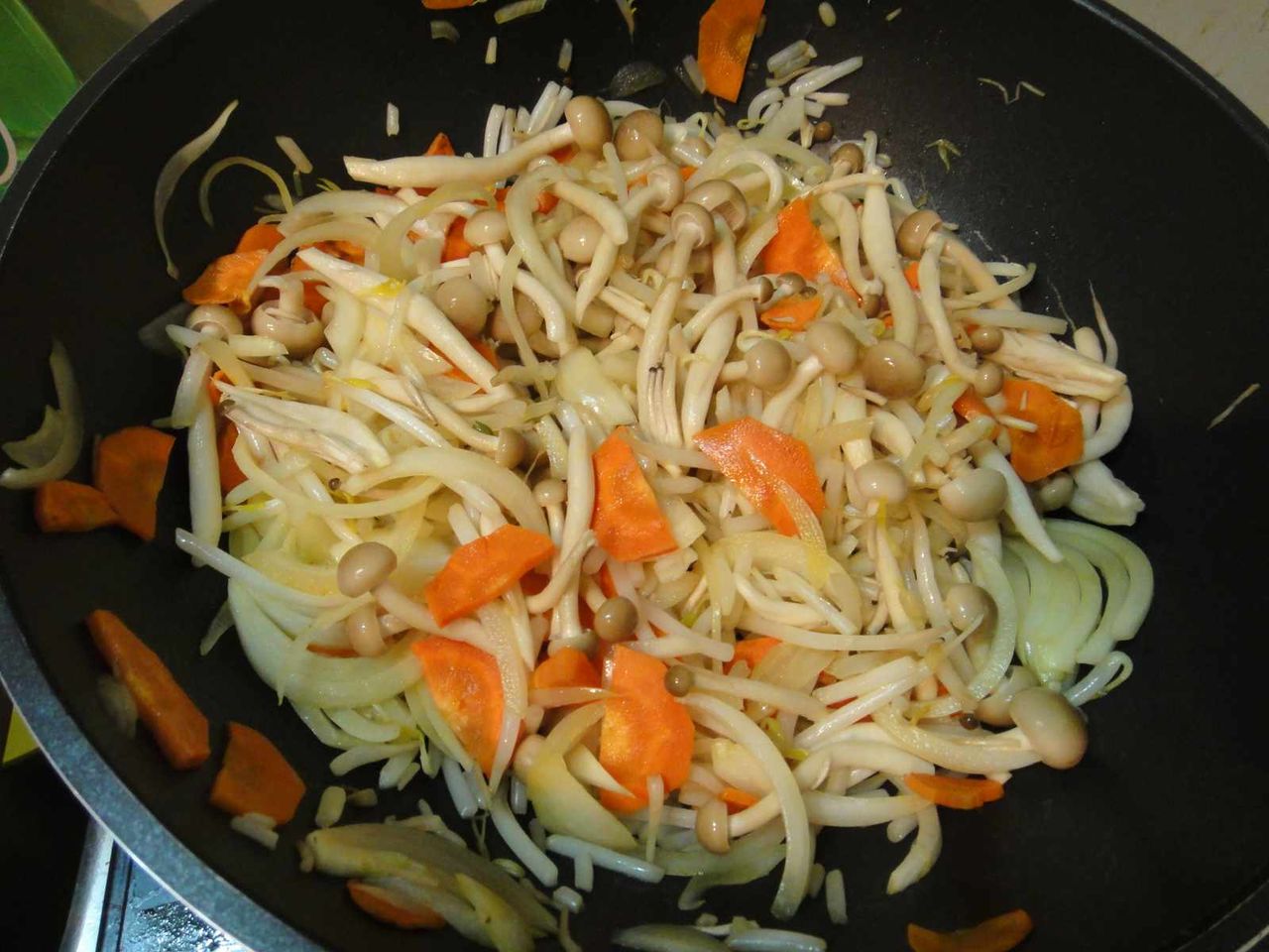 玉ねぎやしめじに人参やもやしなどを炒め
