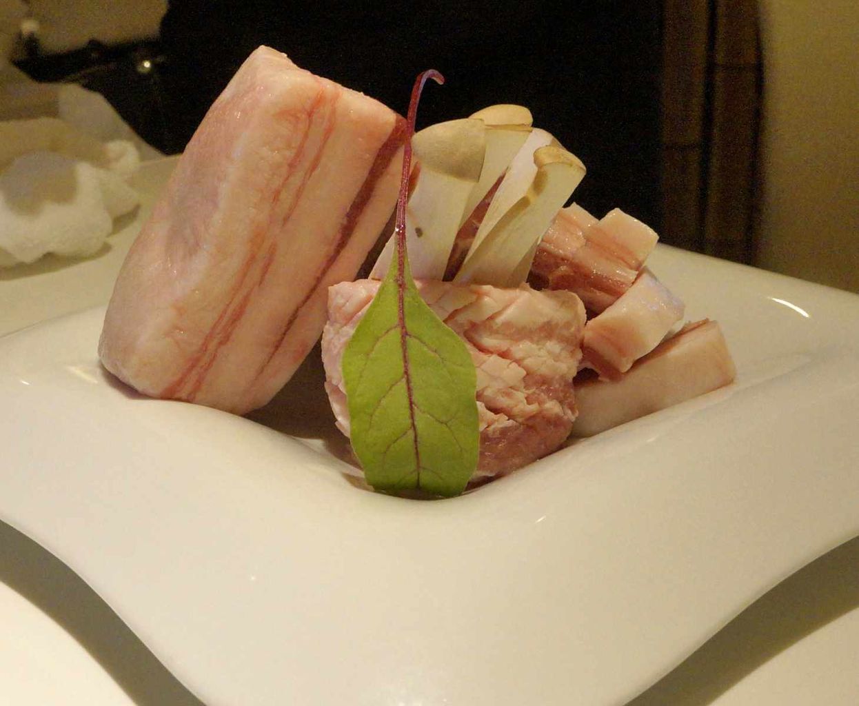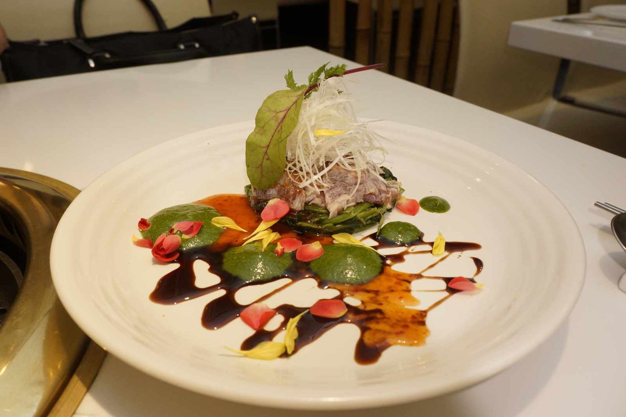 まずは前菜代わりに注文した、造形が美しい豚肉のタタキ系の料理から頂くと