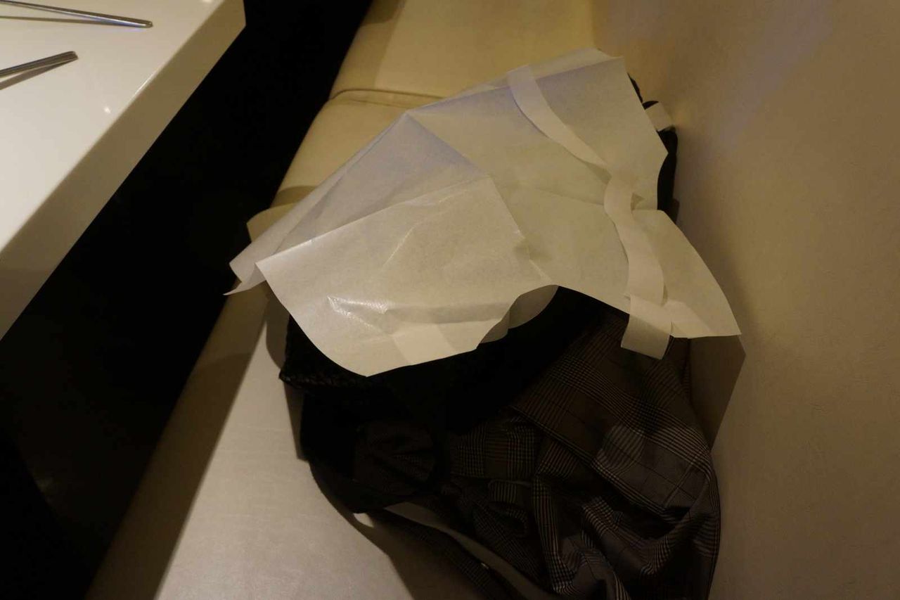 カバンや脱いだ上着の上には、脂避け用の紙エプロンをスタッフの方が被せてくれました。