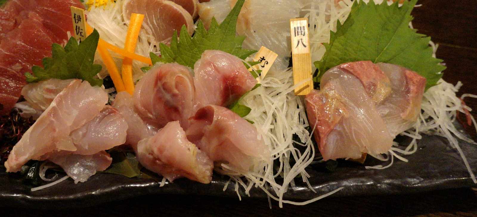 刺身の三点盛りには、注文した鮪(まぐろ)と鱸(すずき)とカンパチと黒ムツとあわせて