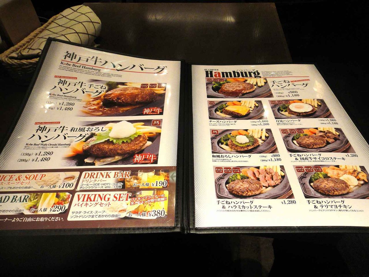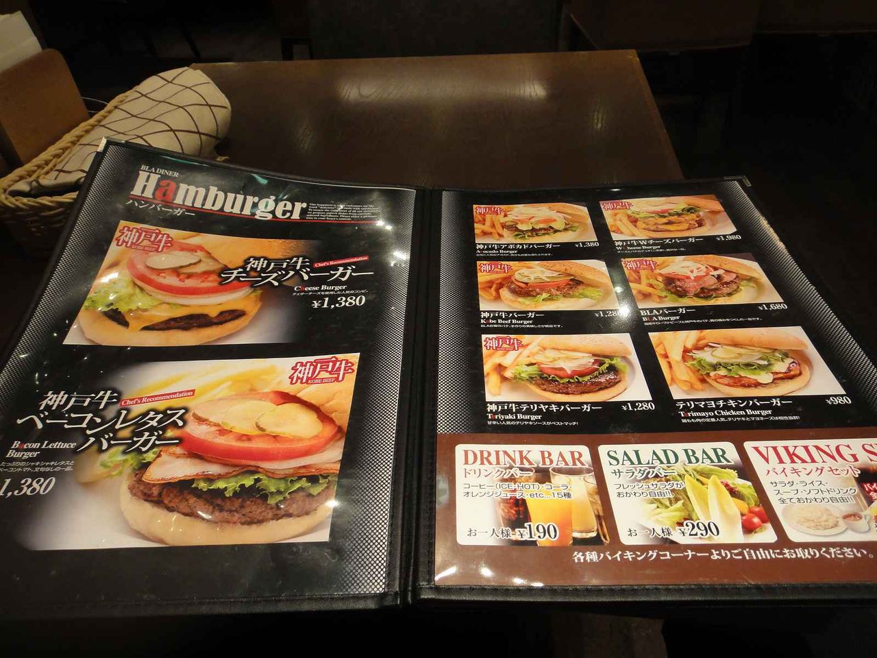 見開き一ページ目に神戸牛を使ったハンバーガーのメニュ-