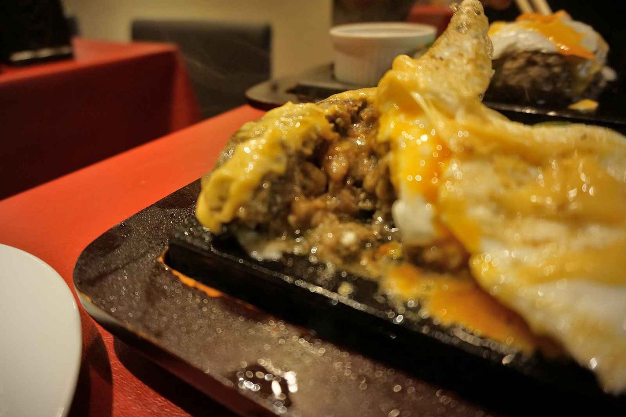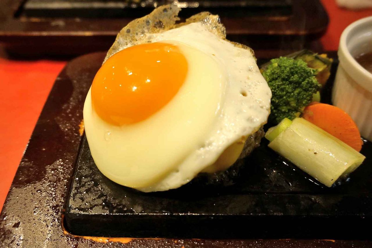卵の下には厚みのあるハンバーグが鎮座し、程よく中が生の状態なので