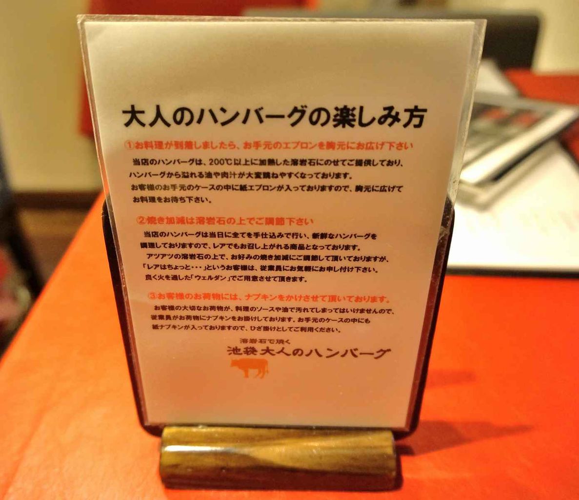 ハンバーグが運ばれてきたら肉汁が飛ぶのでエプロンを掛ける事や
