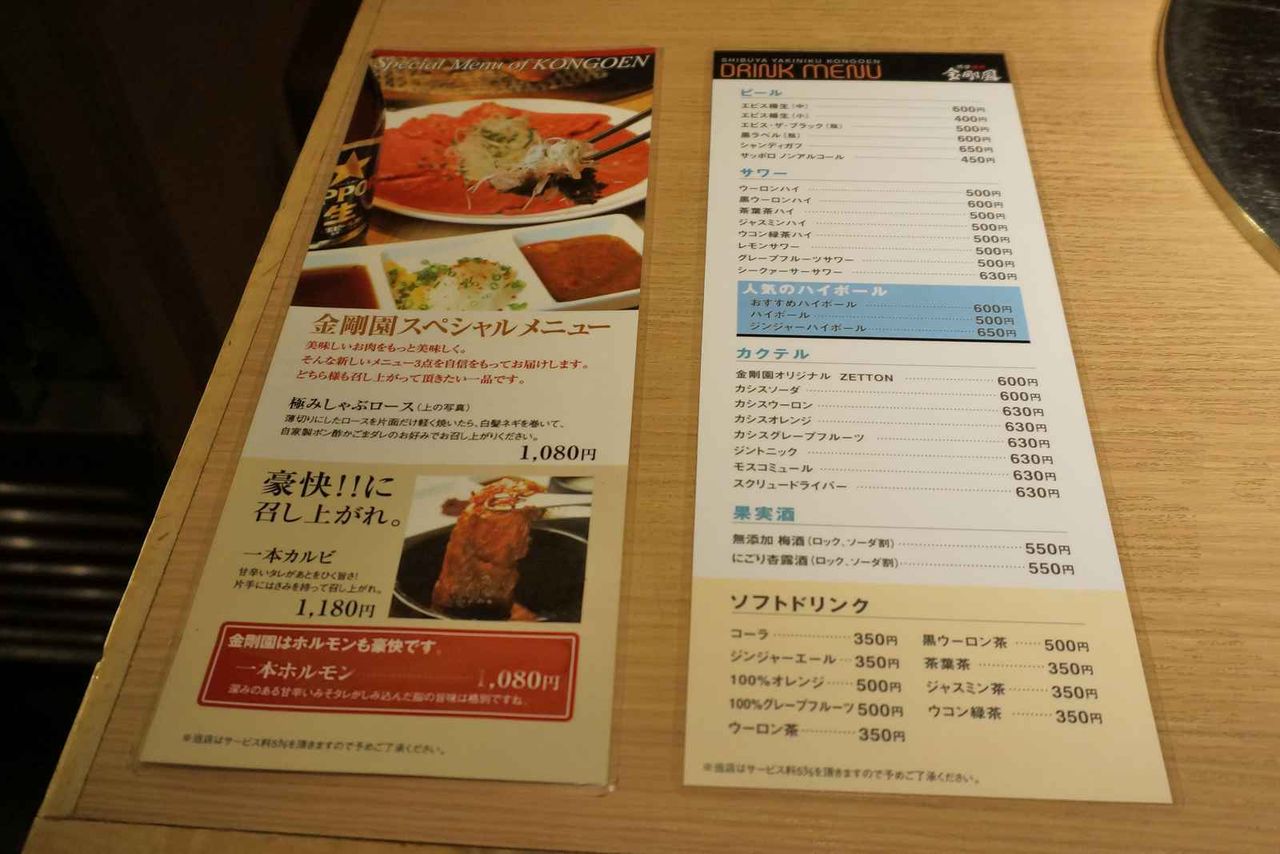 金剛園スペシャルメニューで料理メニューは以上で、飲み物メニューはビール、サワー