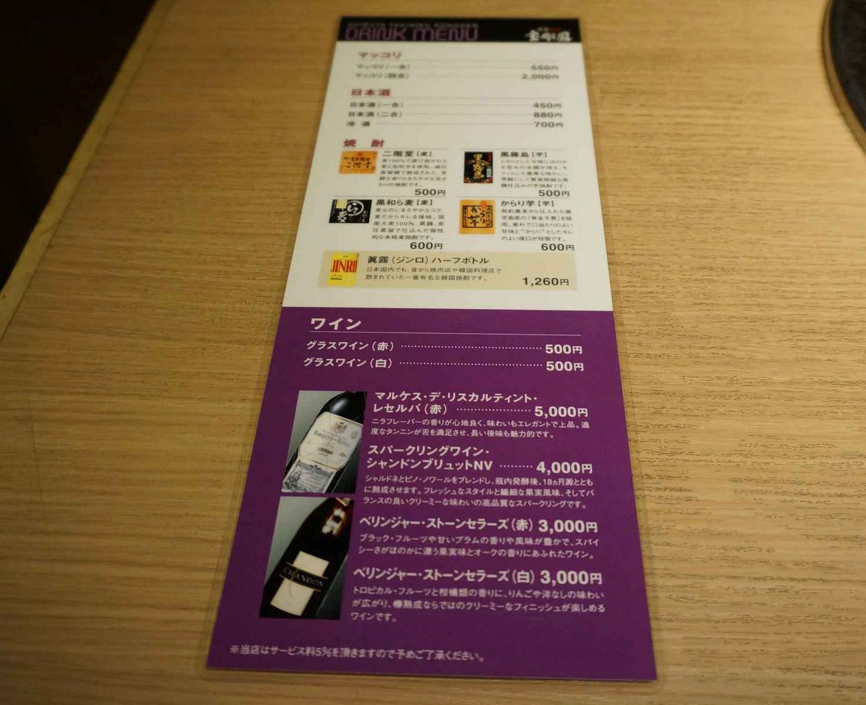 マッコリ、日本酒、焼酎、ワインで以上です。