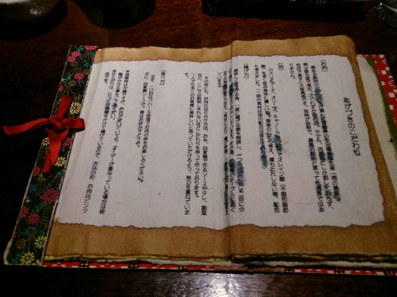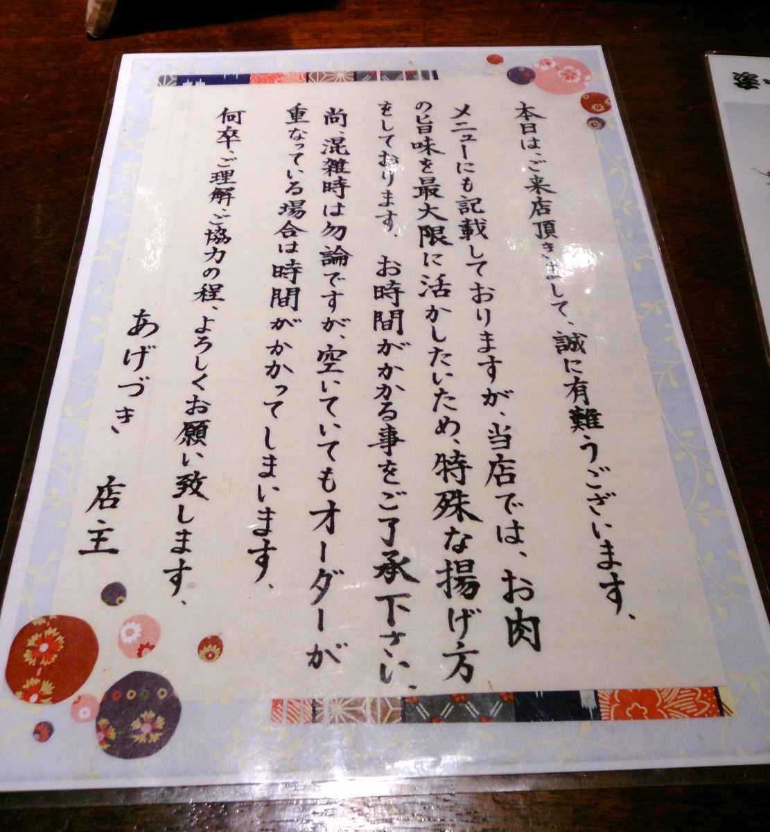 あげづきのとんかつは揚げる方法が特殊なので、出来上がりに時間がかかる旨が記されています。
