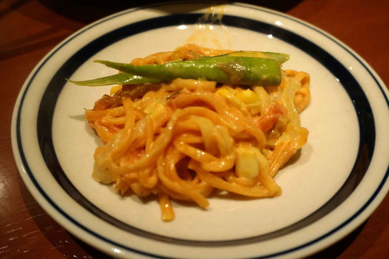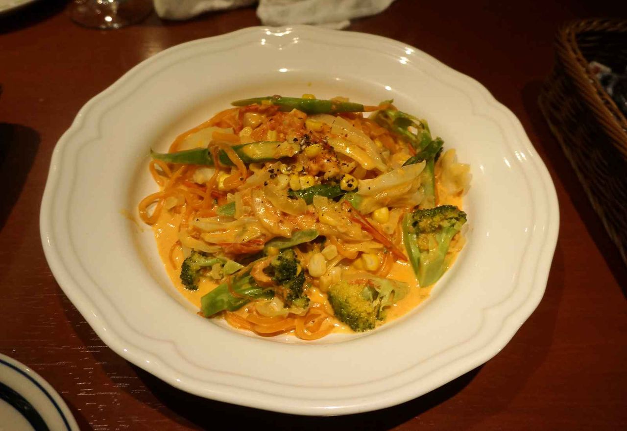 有機野菜のトマトクリーム生パスタは、野菜はシャキシャキ、生麺はモチモチとしていて