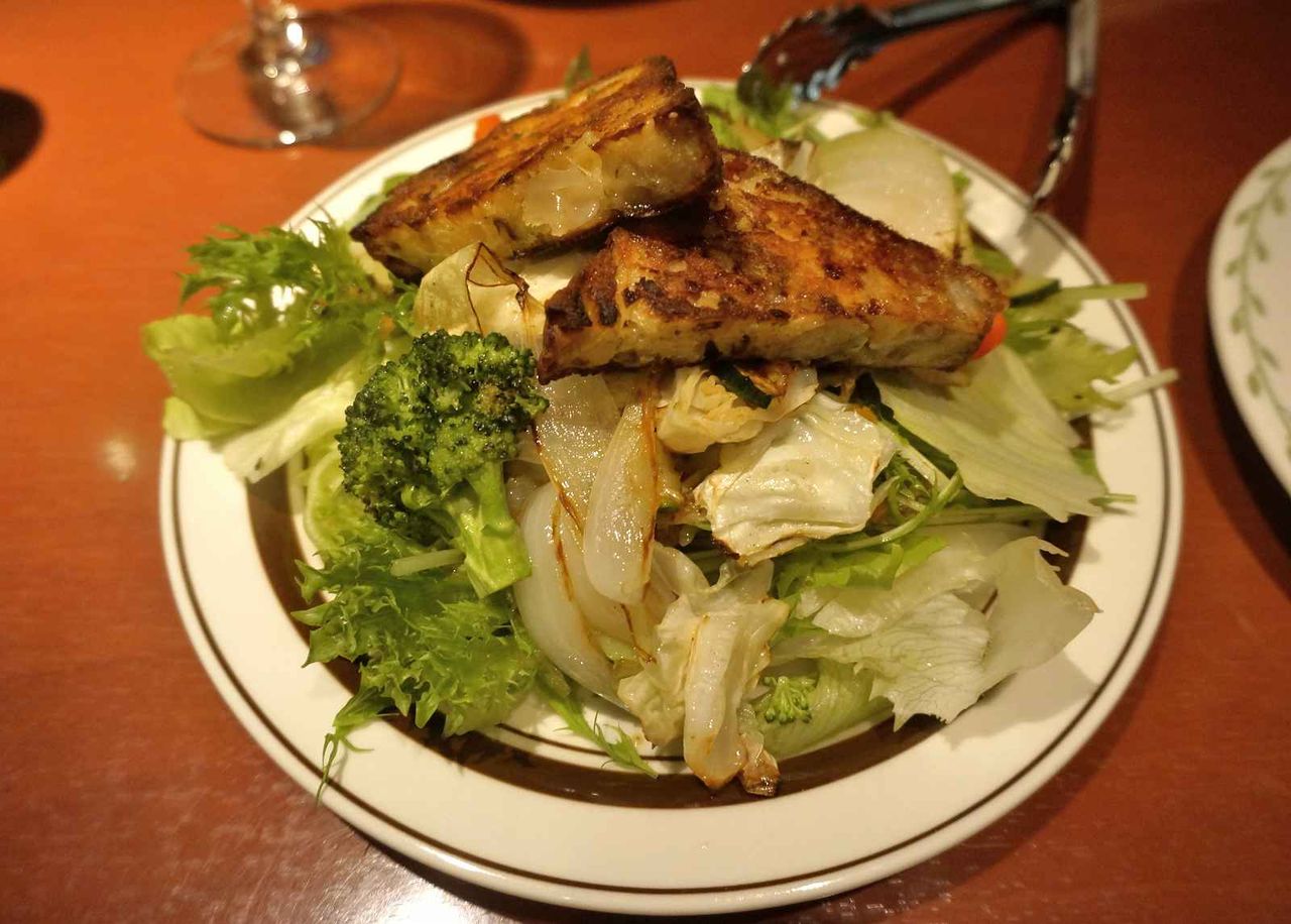 サラダの上に乗った熱々にロティ(ロースト等と同じ意味)されたケーキの様な料理の中には