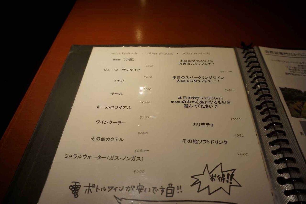その後は飲み物メニューへと続き、グラスワインやカクテルにソフトドリンクがあり