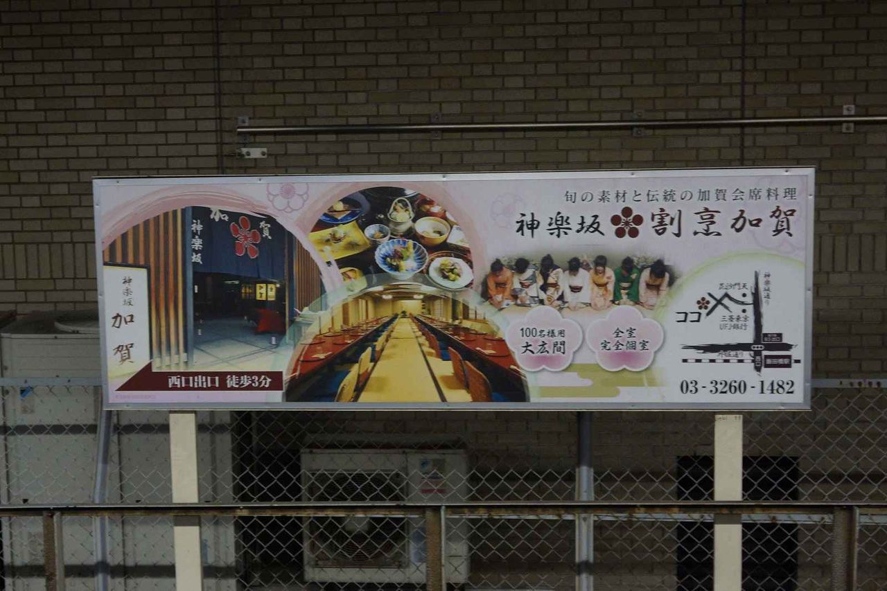 飯田橋駅のホームからは、花街神楽坂を思わせる立て看板があるのを見ると