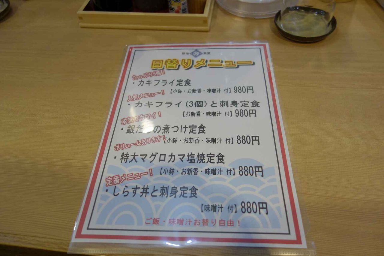日替わりメニューを見ると、刺し身とカキフライが同時に味わえる