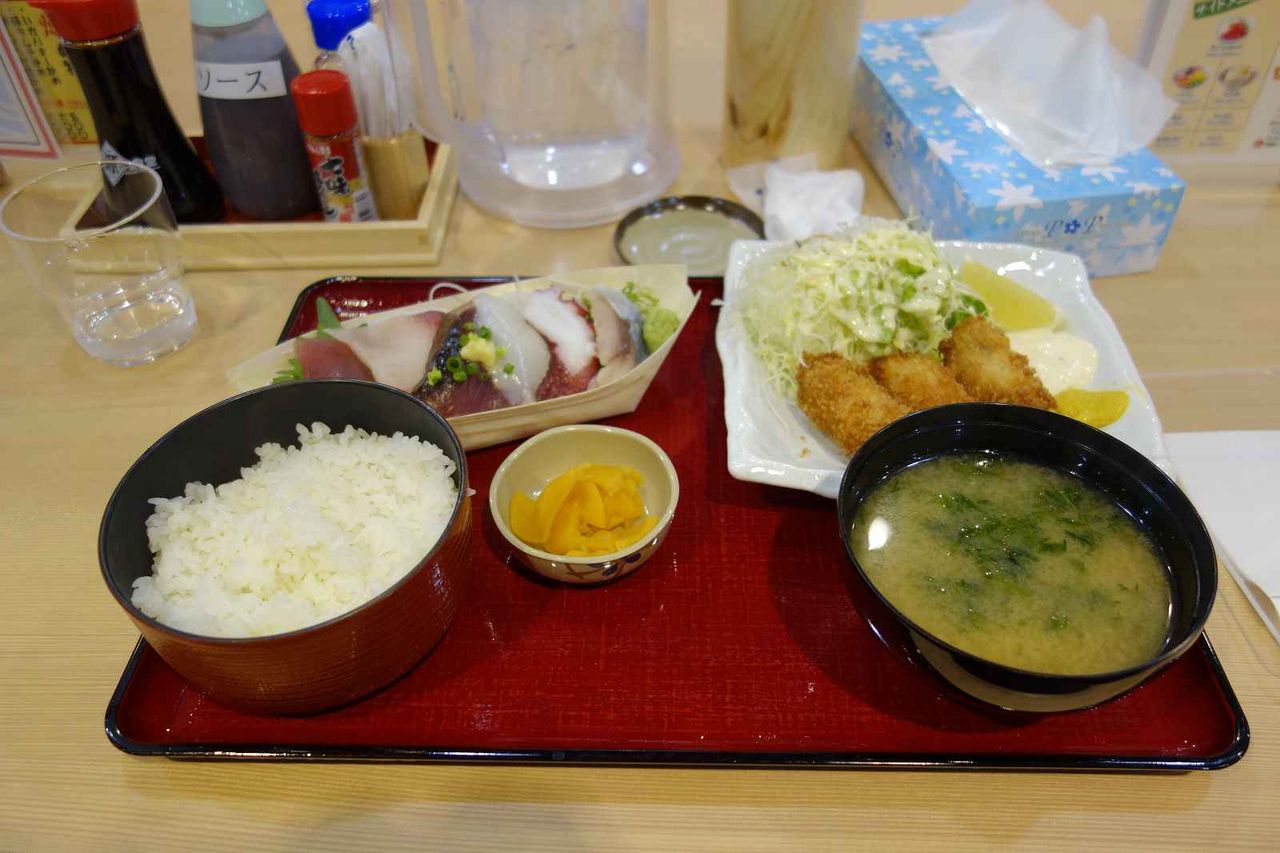 カキフライ(3個)と刺身定食980円があったので、セットランチメニューを注文し