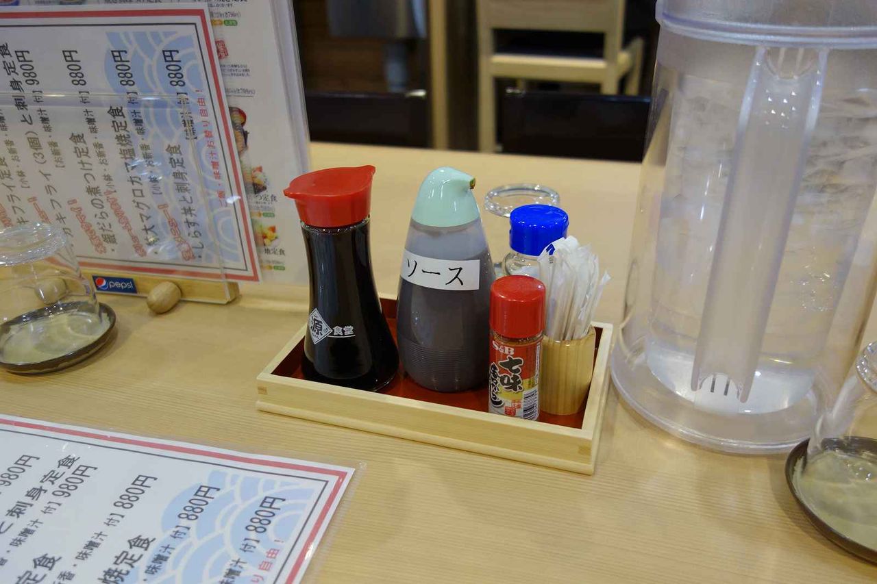 注文した料理を待つ間、お水を取りつつ、調味料を激写しながら過ごし