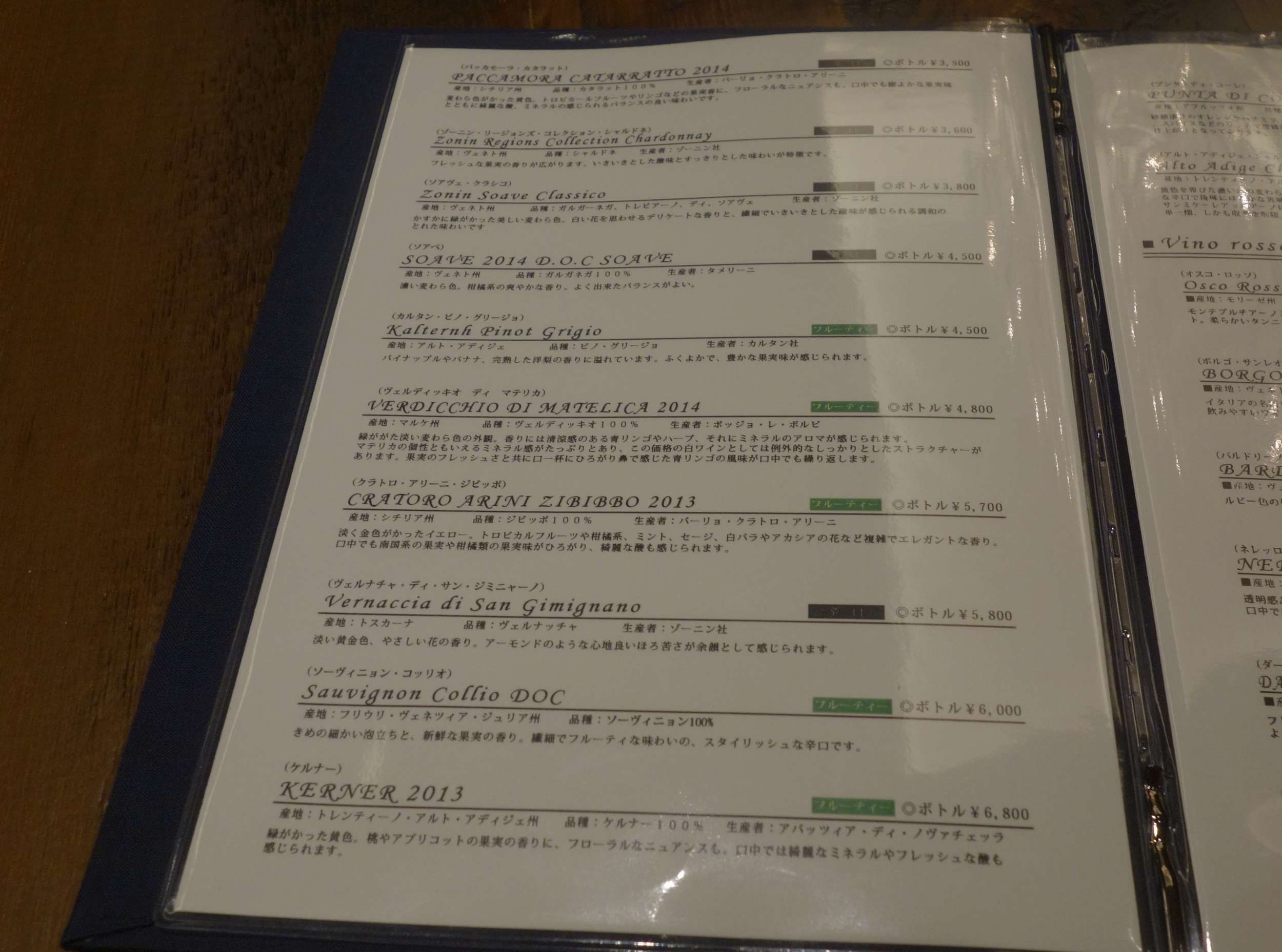 メニュー表を見ていくと、ドリンクメニューはビール、本日のグラスワイン、食前酒、カクテル、ウィスキー、ヴェルモット、グラッパ、ソフトドリンク