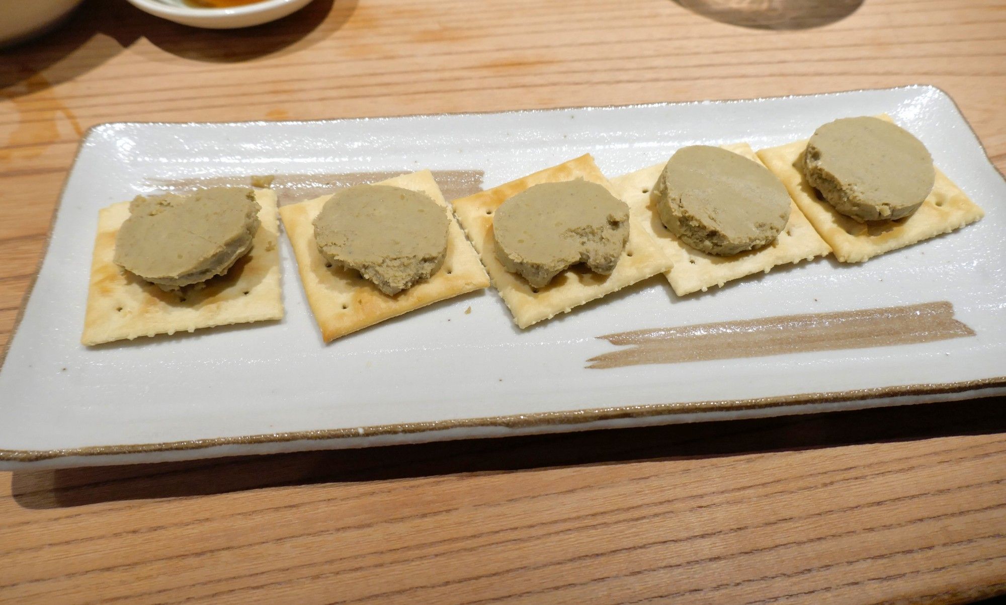 「かにみそバター」480円は、パテ状にしたかにみそバターをクラッカーの上に載せたもので