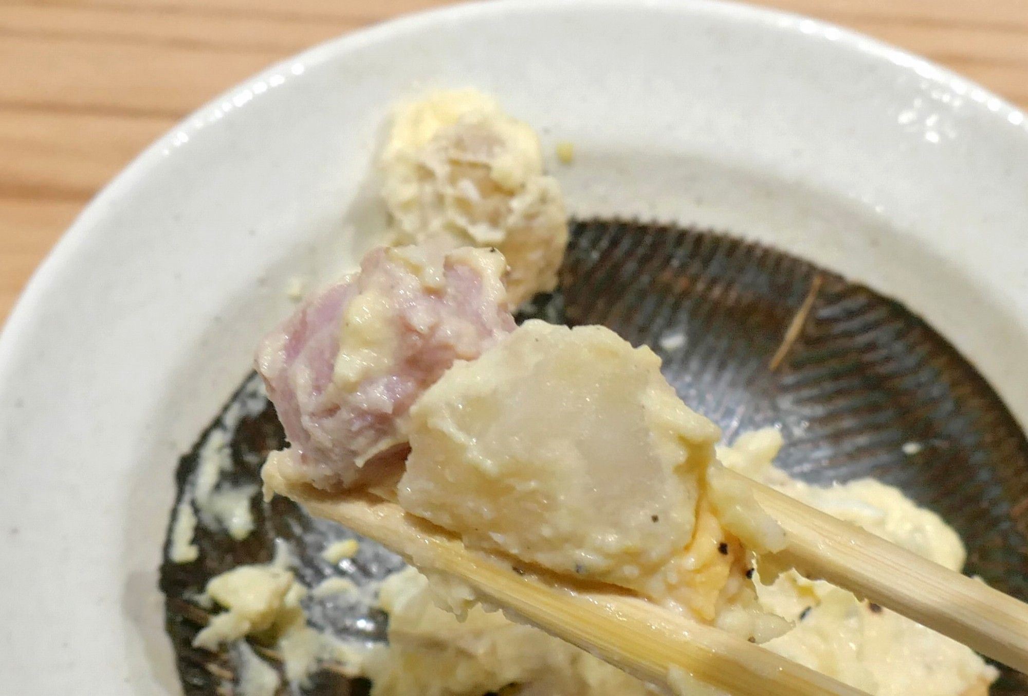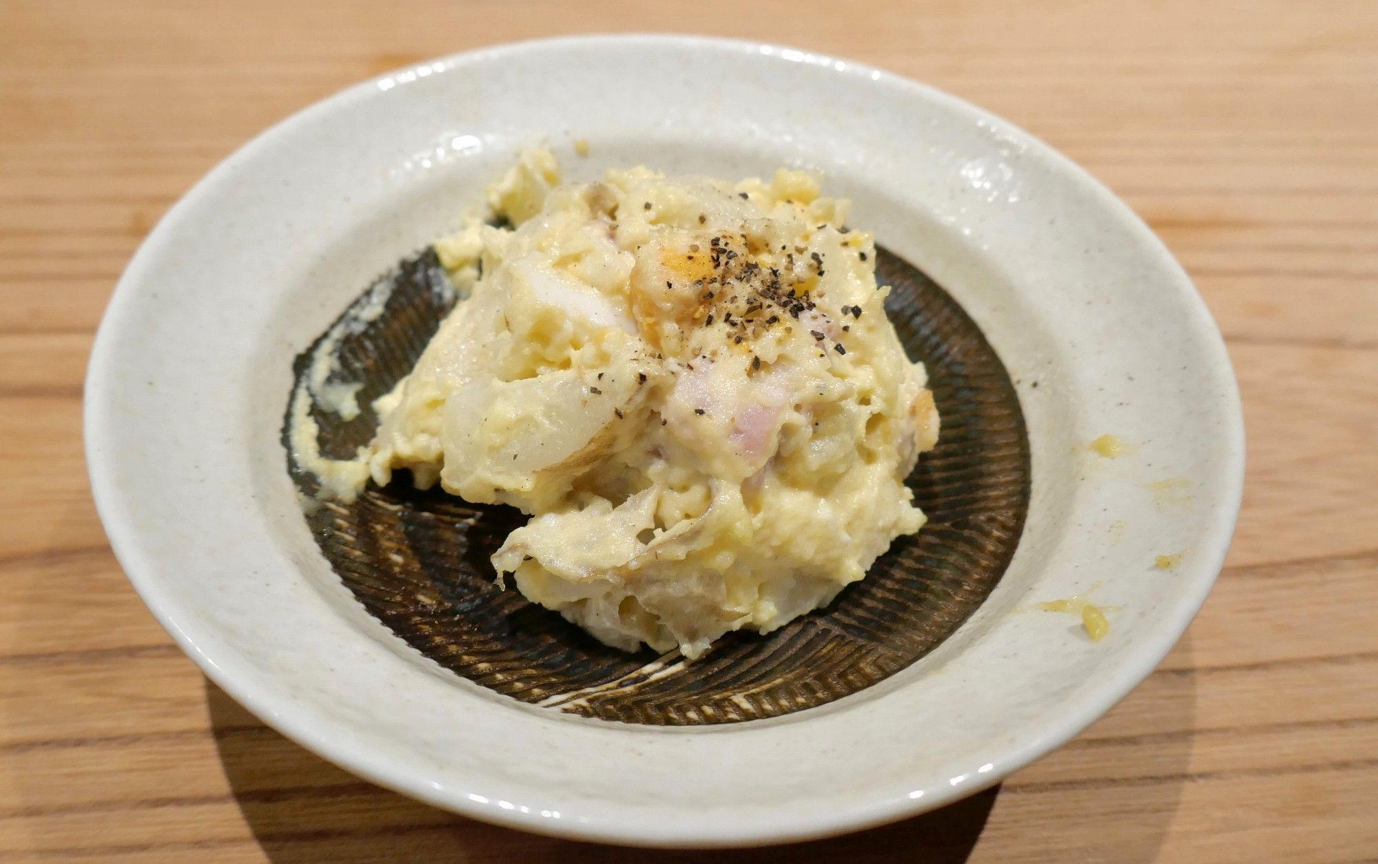 お通しとして具だくさんなポテサラが着皿。
