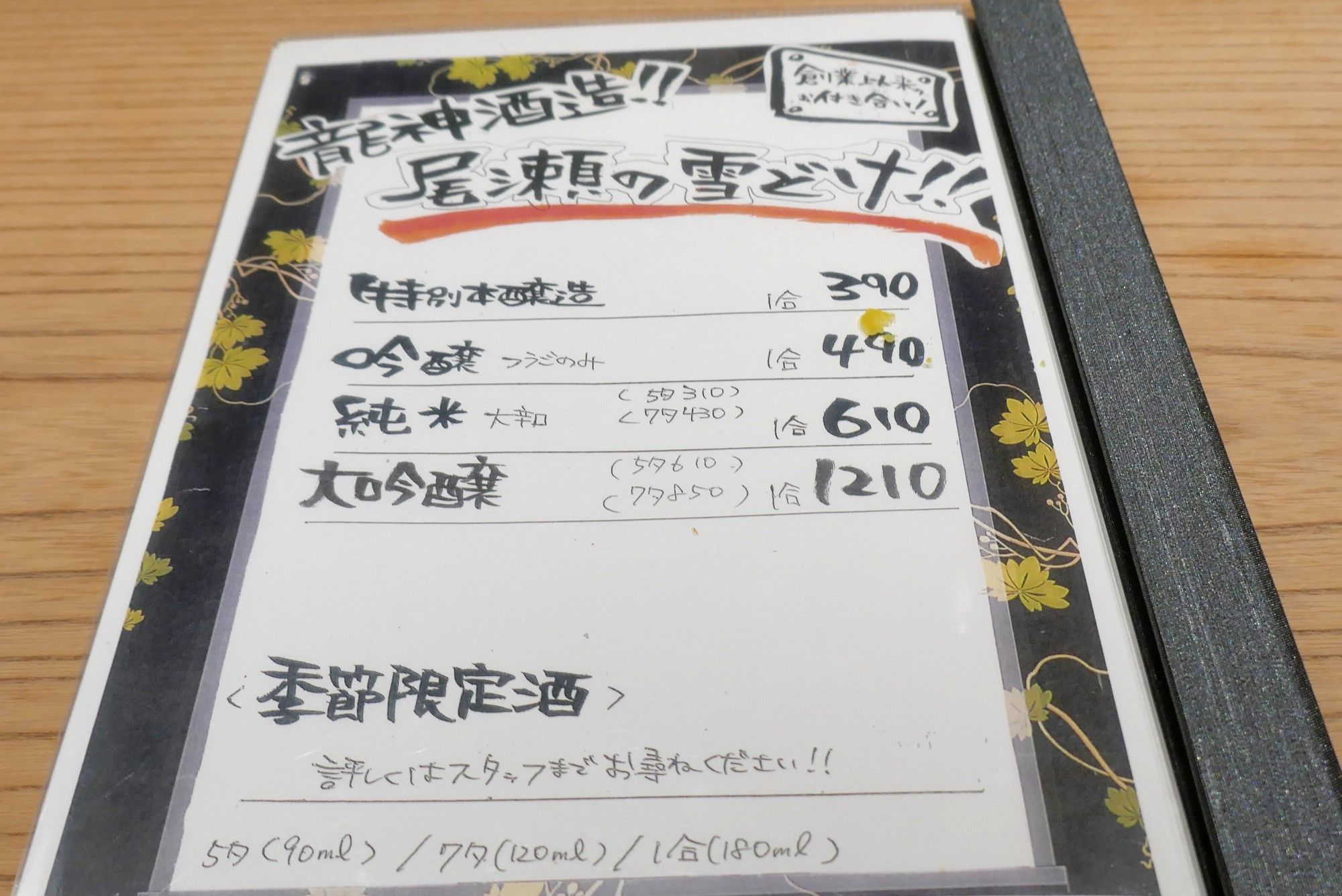 龍神酒造尾瀬の雪どけメニューでドリンクメニューは以上です。