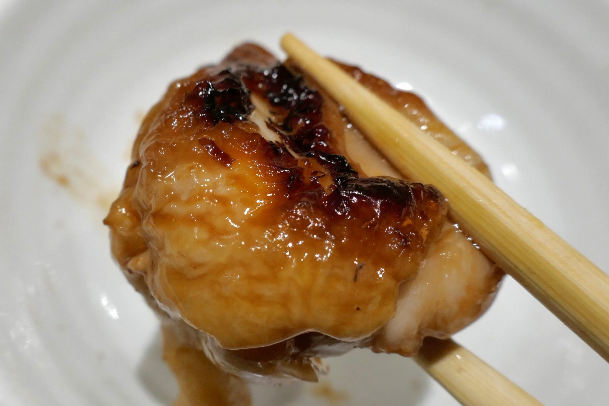 甘いタレがかかった焼き鳥は、大きな鶏肉を使ったことでいつもの焼き鳥以上のジューシー感にビックリ!甘辛いタレとも良く合います。