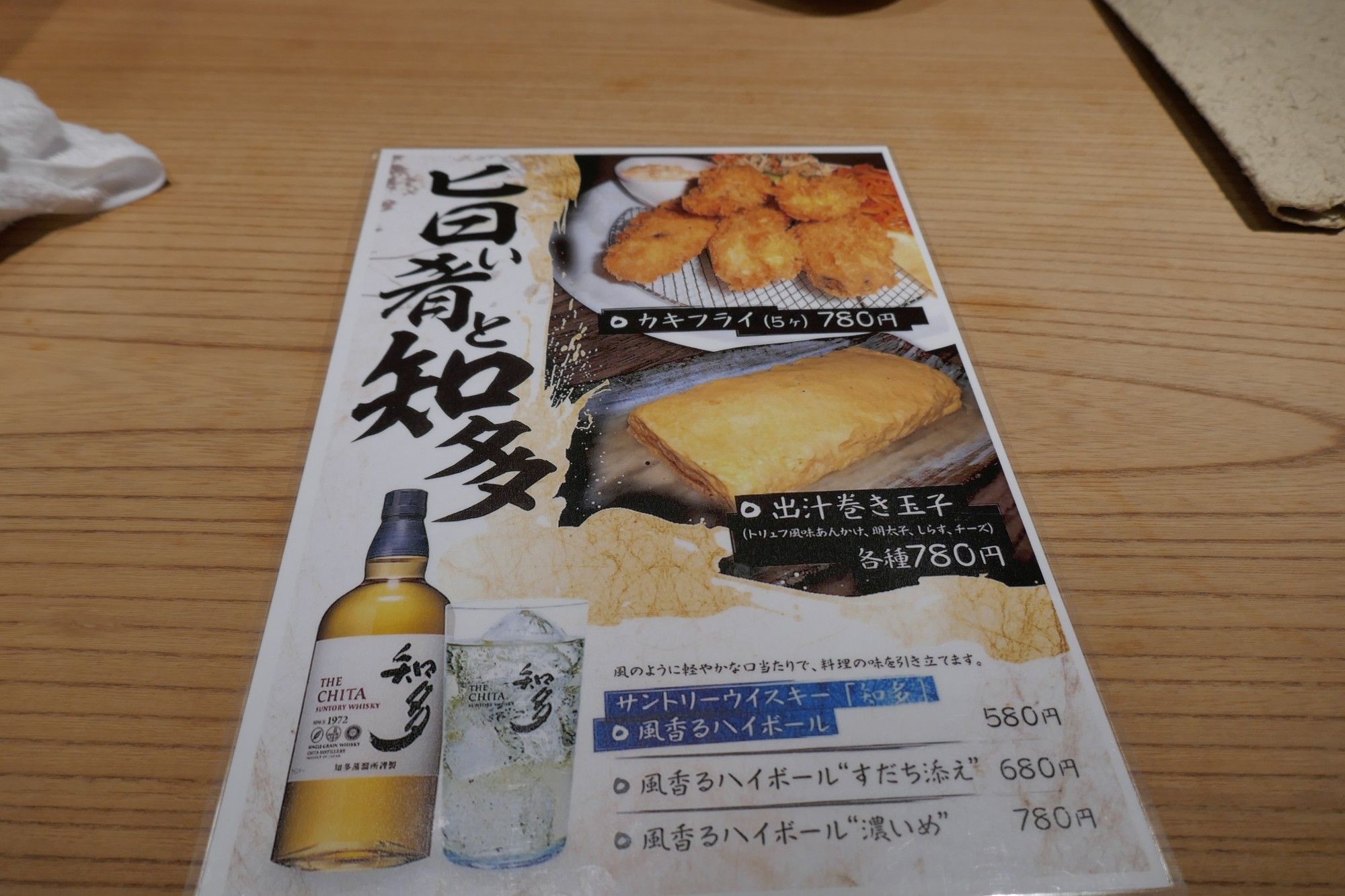 知多ハイボールと、相性の良い料理の紹介で別紙メニューは以上です。