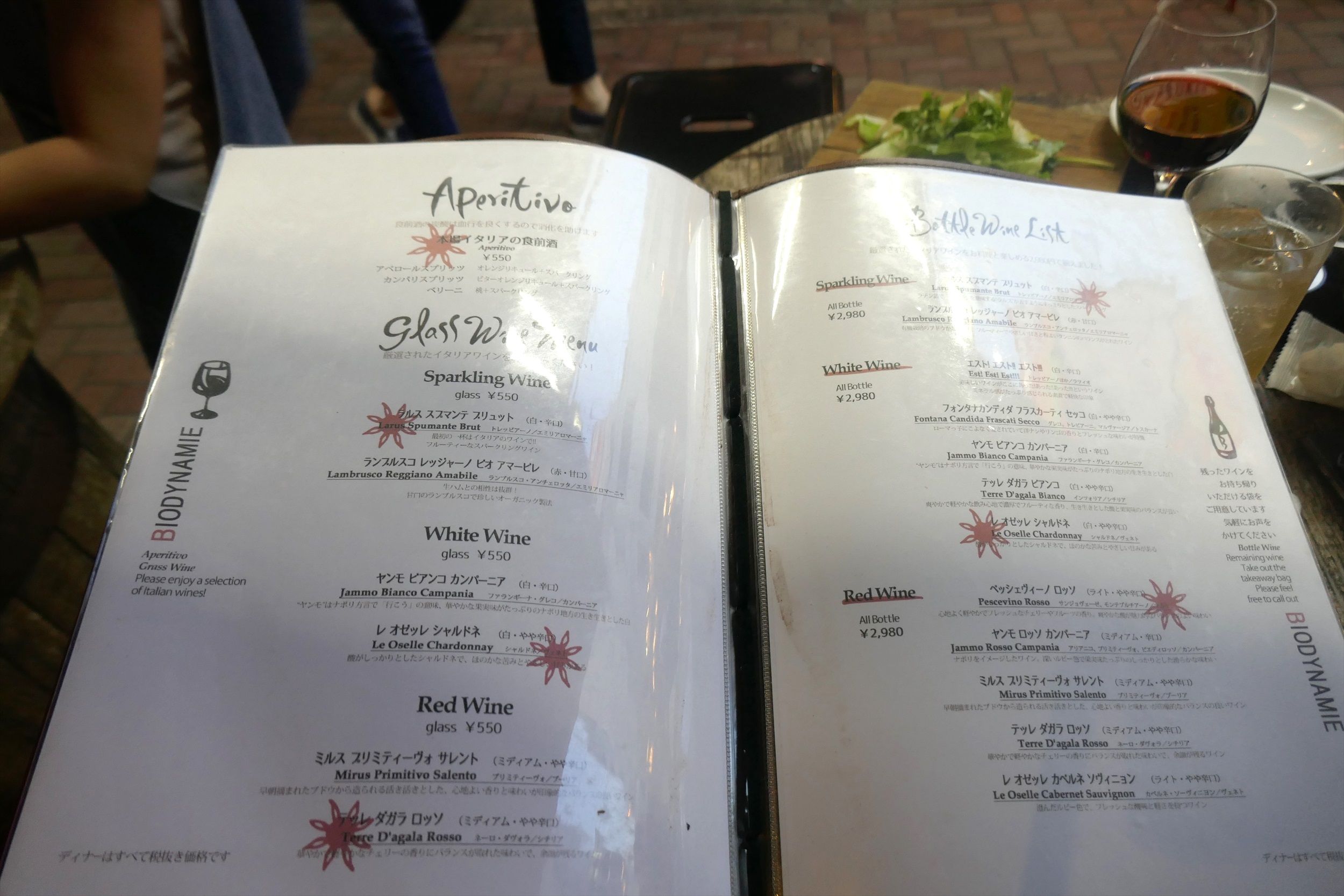 食前酒、グラスワイン(スパークリング、白、赤)、ボトルワインメニュー