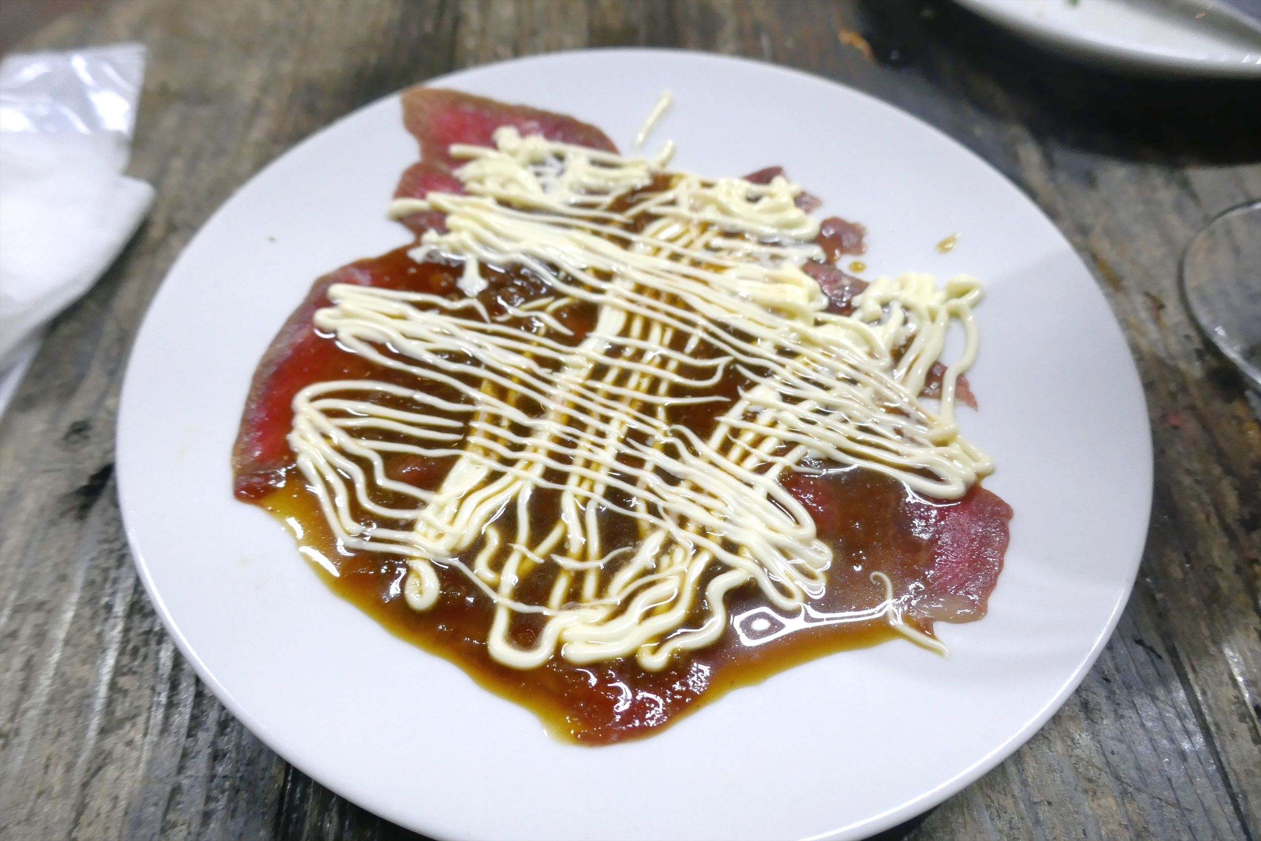 最後に食べた「お肉のカルパッチョ」は、甘じょっぱいソースとマヨネーズが濃すぎる点が残念でしたが、フレッシュなレアスタイルなお肉の美味しさに満足!ごちそうさまでした!