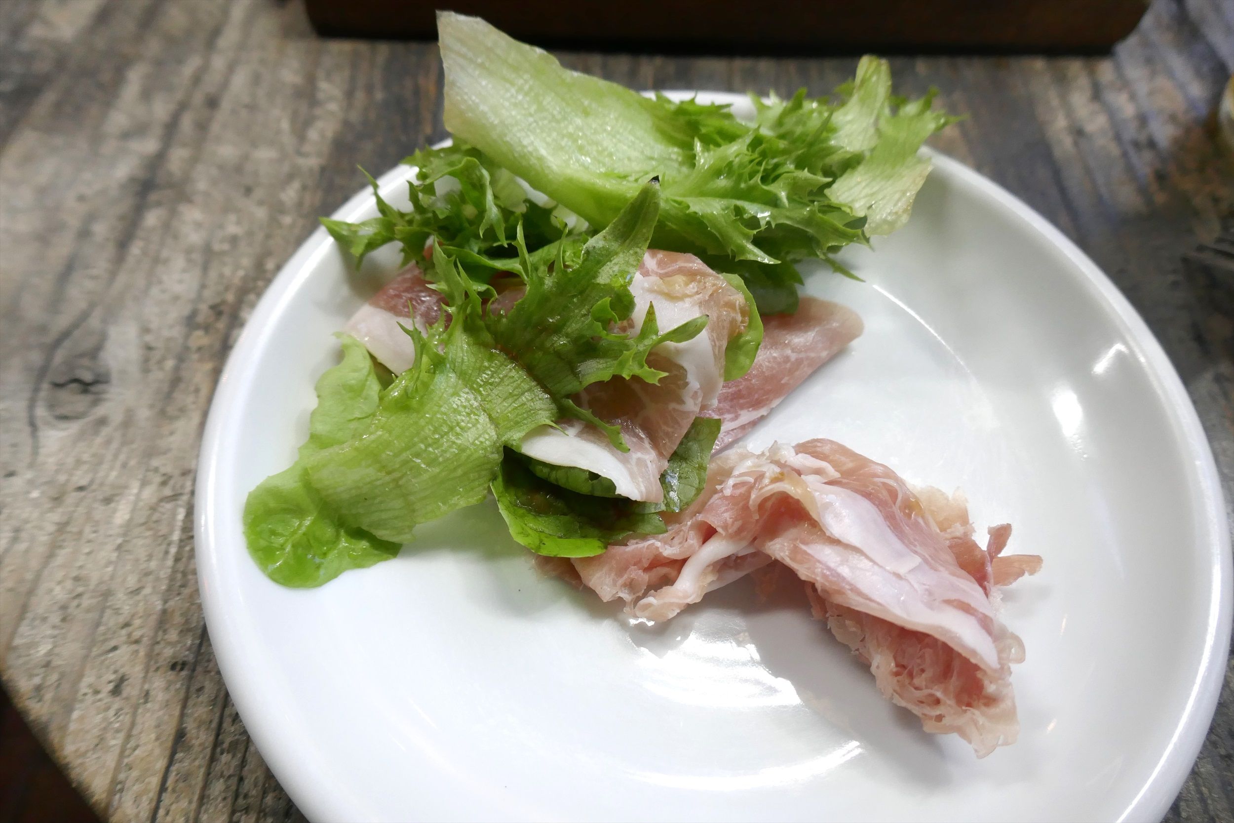 サラダのように盛られた「生ハム」は、塩気が強めで葉物野菜との相性もバッチリ!お酒もメチャ進みます!