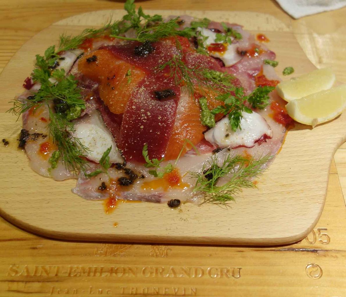 木の板の上に盛られたメリメロカルパッチョLサイズが目の前に運ばれ