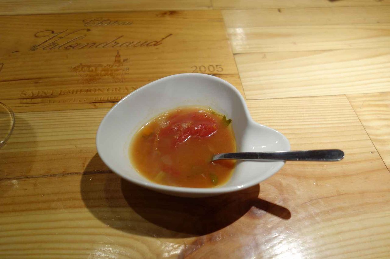 その後お通しの酸味と旨味がいい感じのトマトスープを頂き