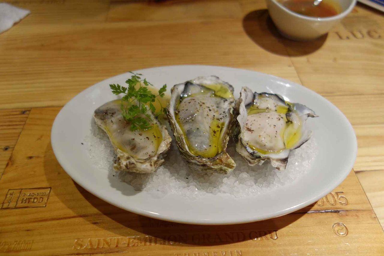 生牡蠣の三種盛りは左から、大分産、広島産、ニュージランド産となり