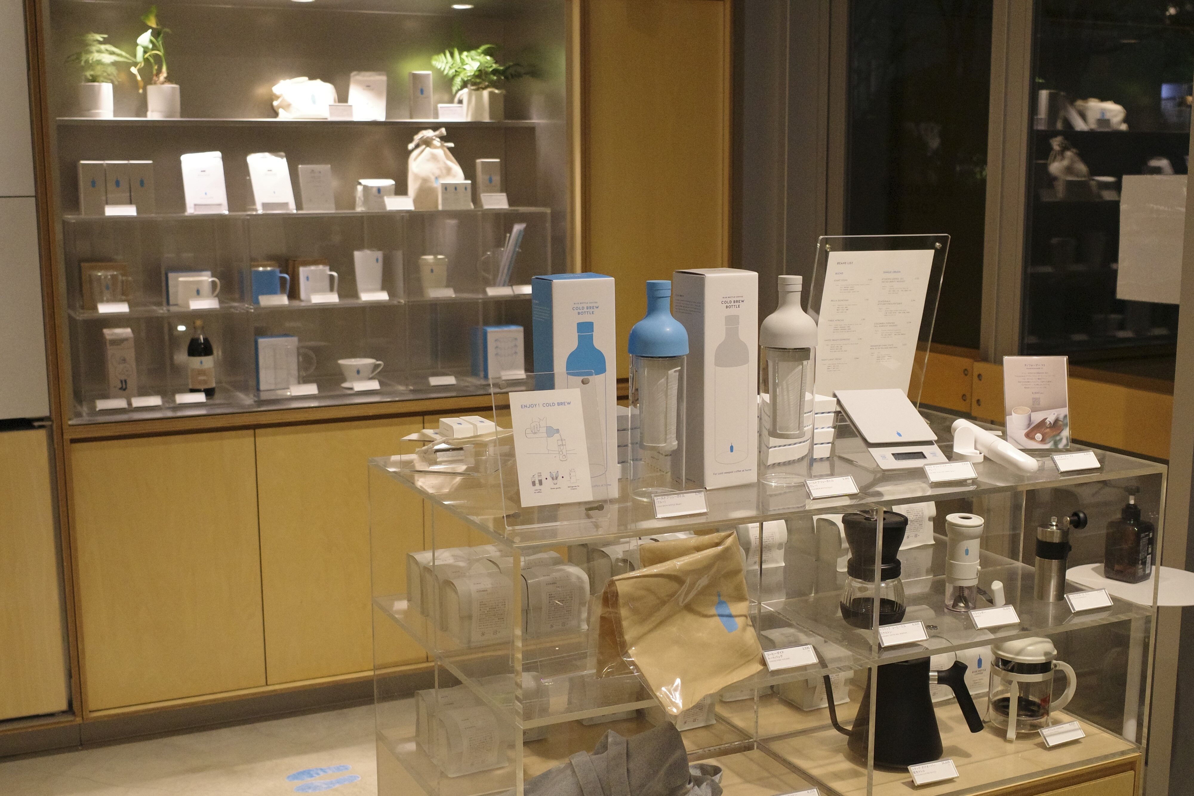 入口付近にはブルーボトルコーヒーのグッズ類、自宅でブルーボトルコーヒーが楽しめるキットがセットされていました。