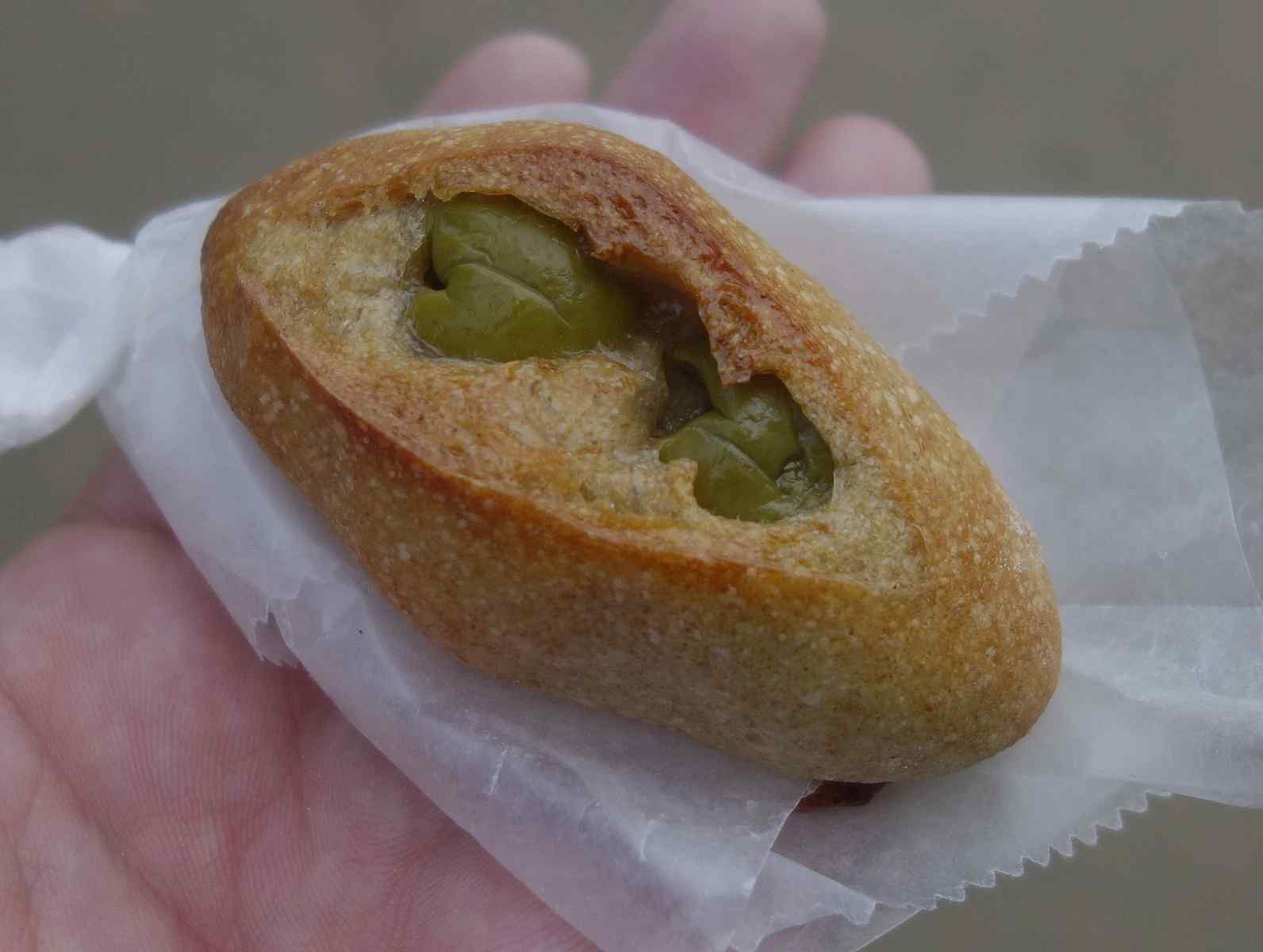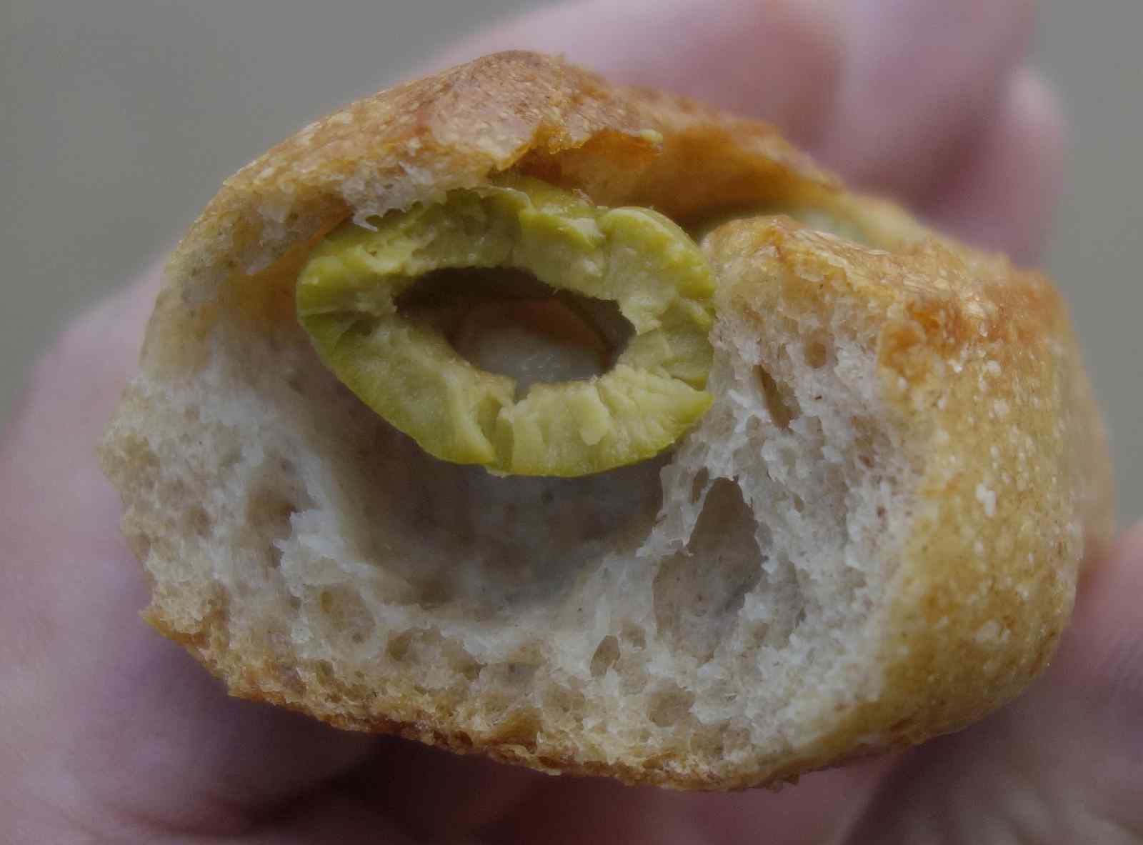 実食してみると、バケット生地の中にオリーブを入れたパンで