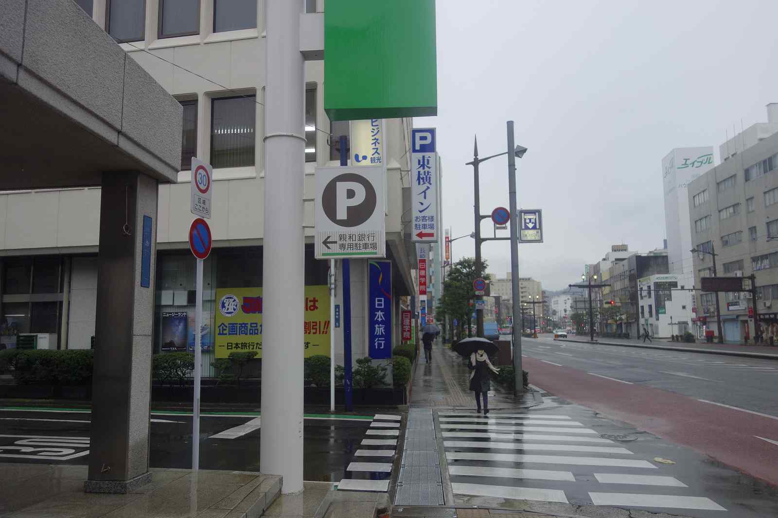 奥に東横インの駐車場の看板が見えてくる交差点を