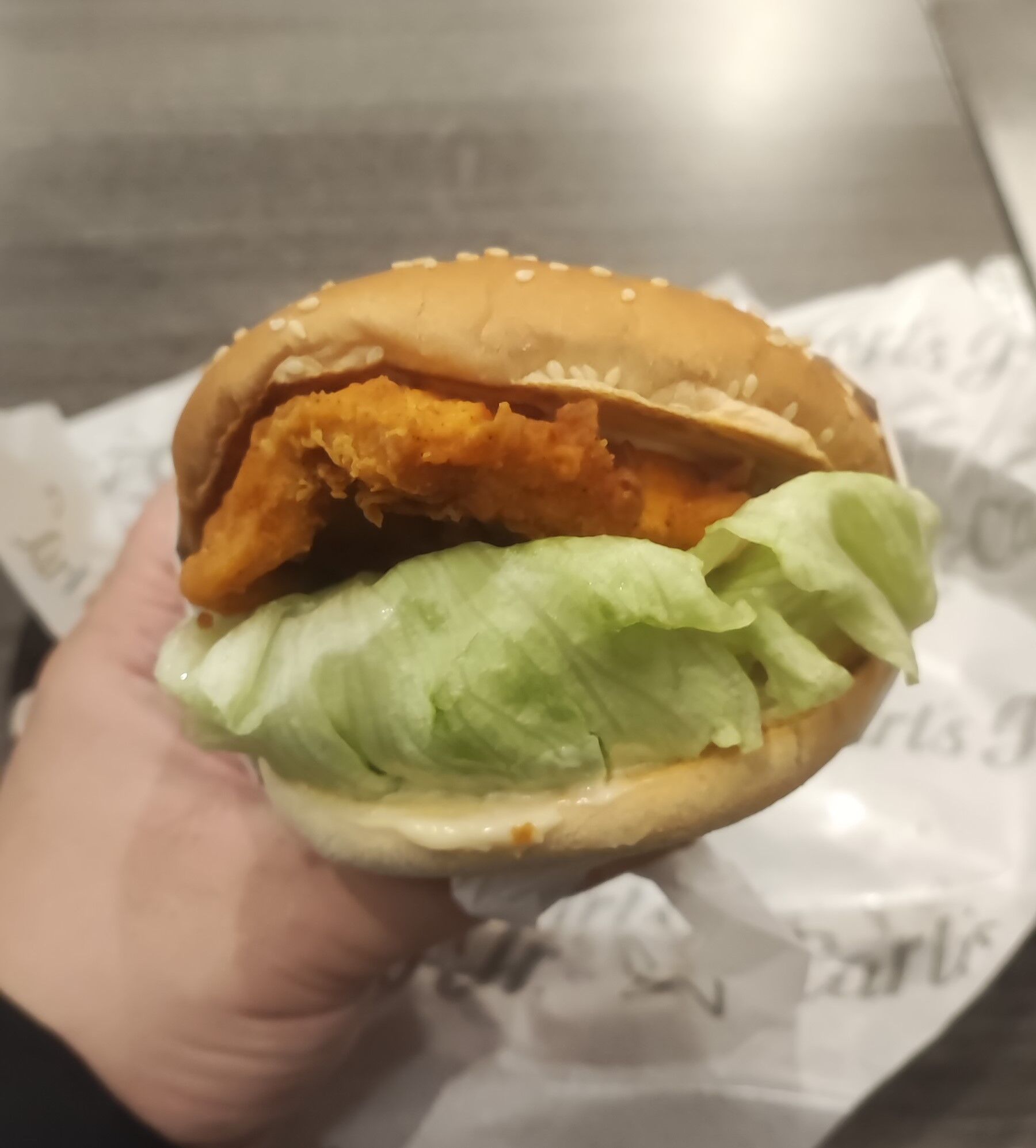 チキンフィレサンドは分厚く香ばしいごま付きバンズを噛み締めたあとに、コクに満ちたマヨネーズ、熱々で肉肉しく衣がスパイシーなチキンフィレオ、シャキシャキ食感のレタスが入ってウマー!