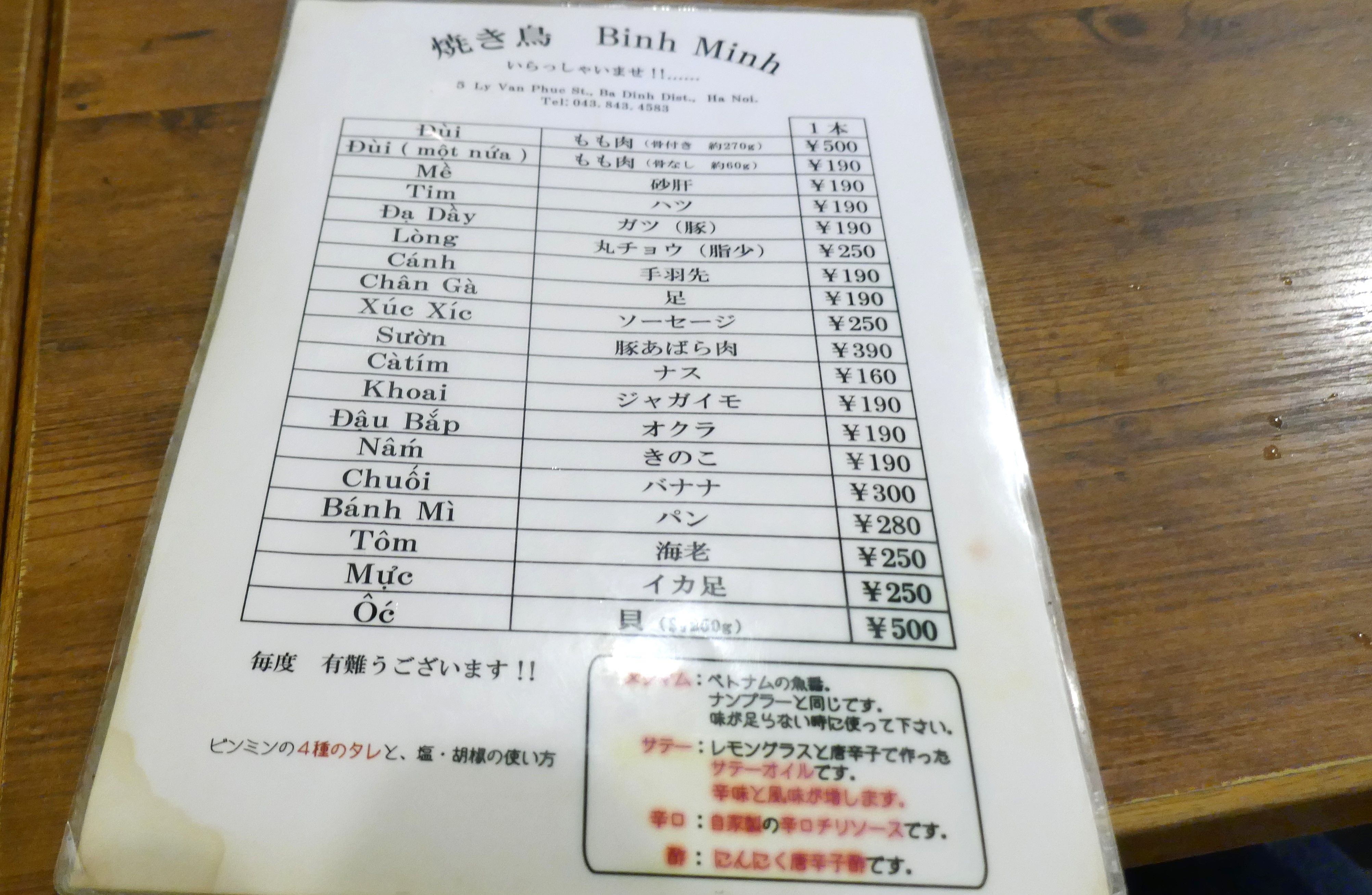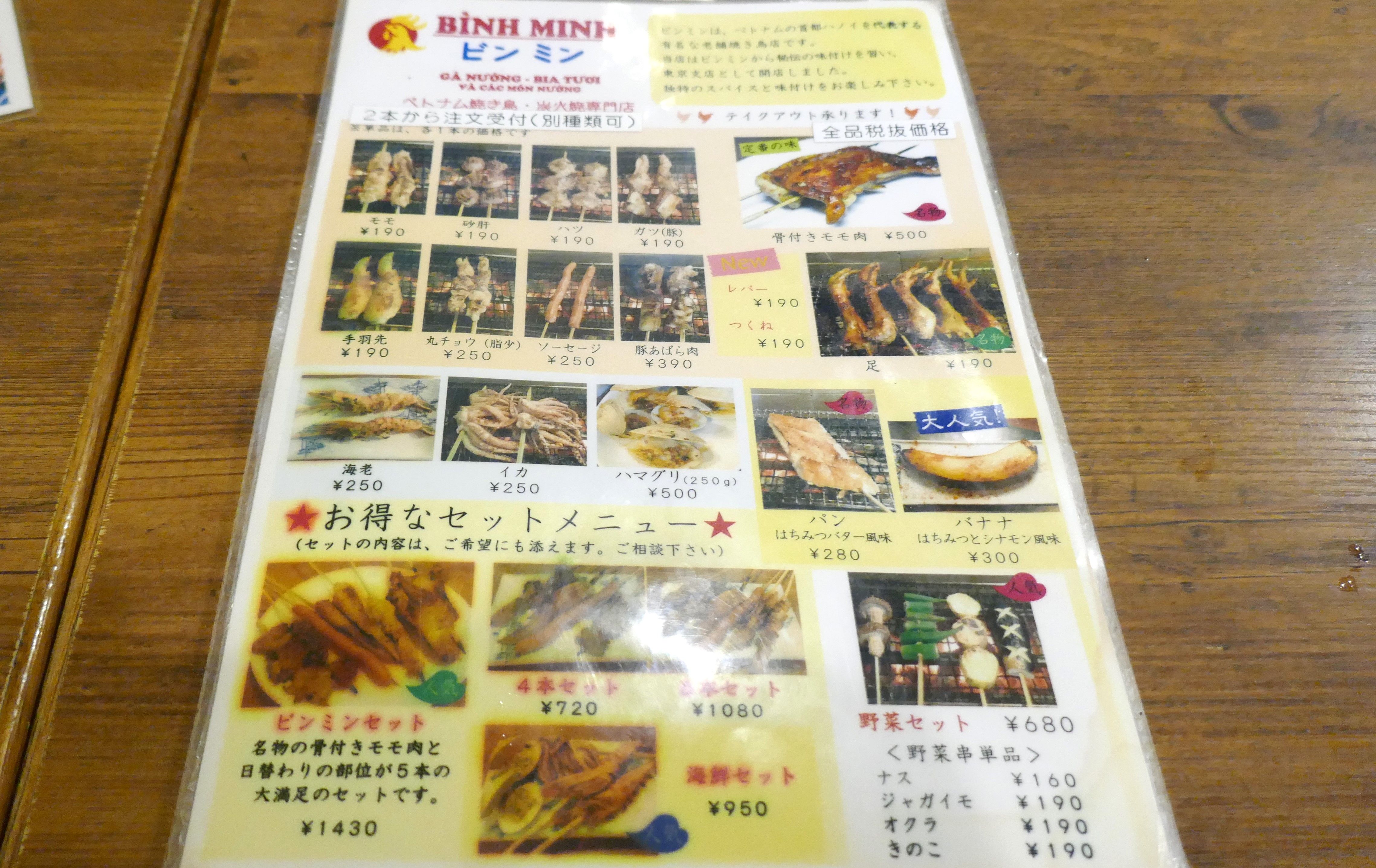 Binh minhの各種焼き鳥メニュー