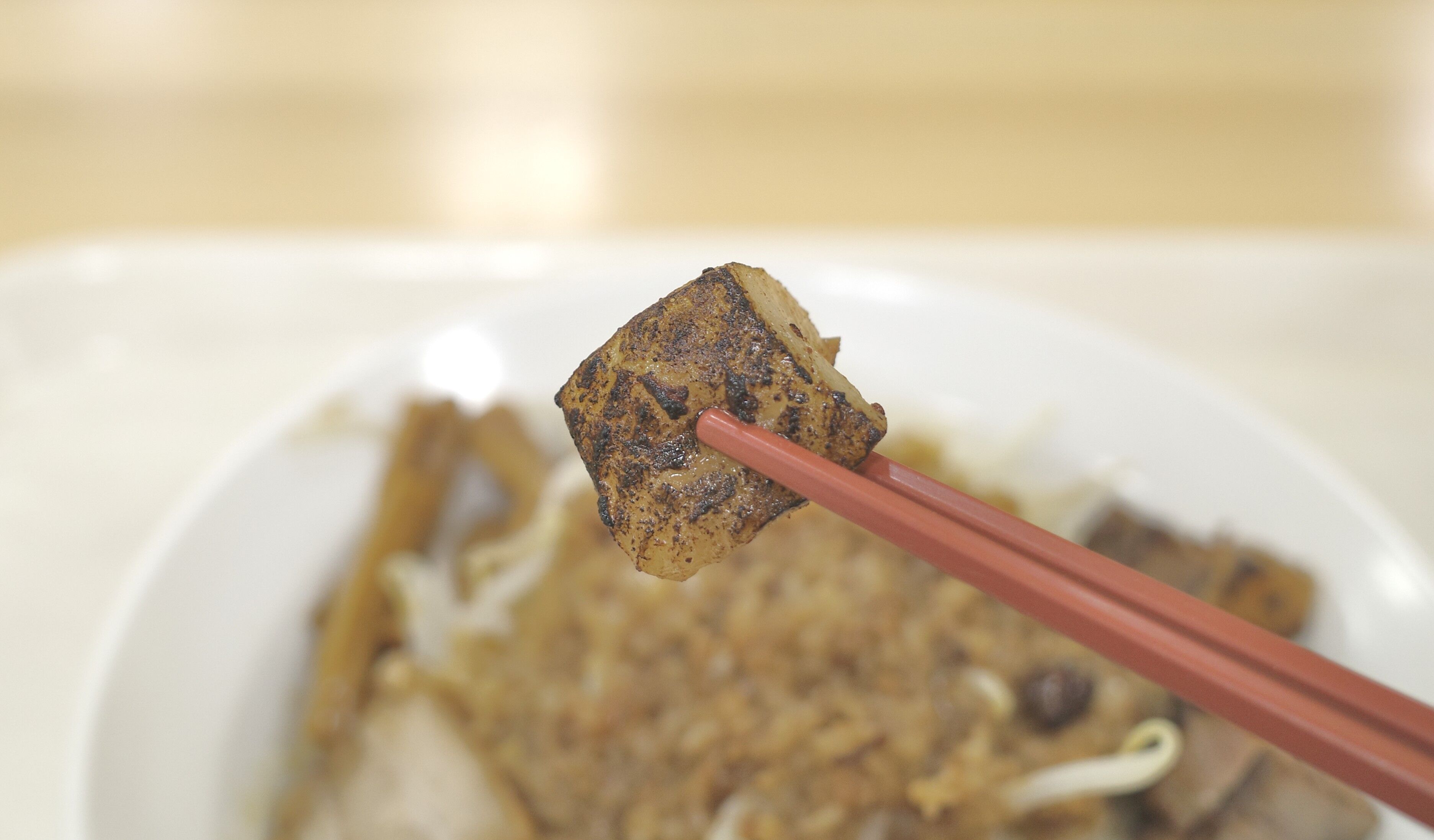 早速ブロック状のチャーシューにかぶりつくと、焦がした風味とともに脂の甘味が交差してウマー!