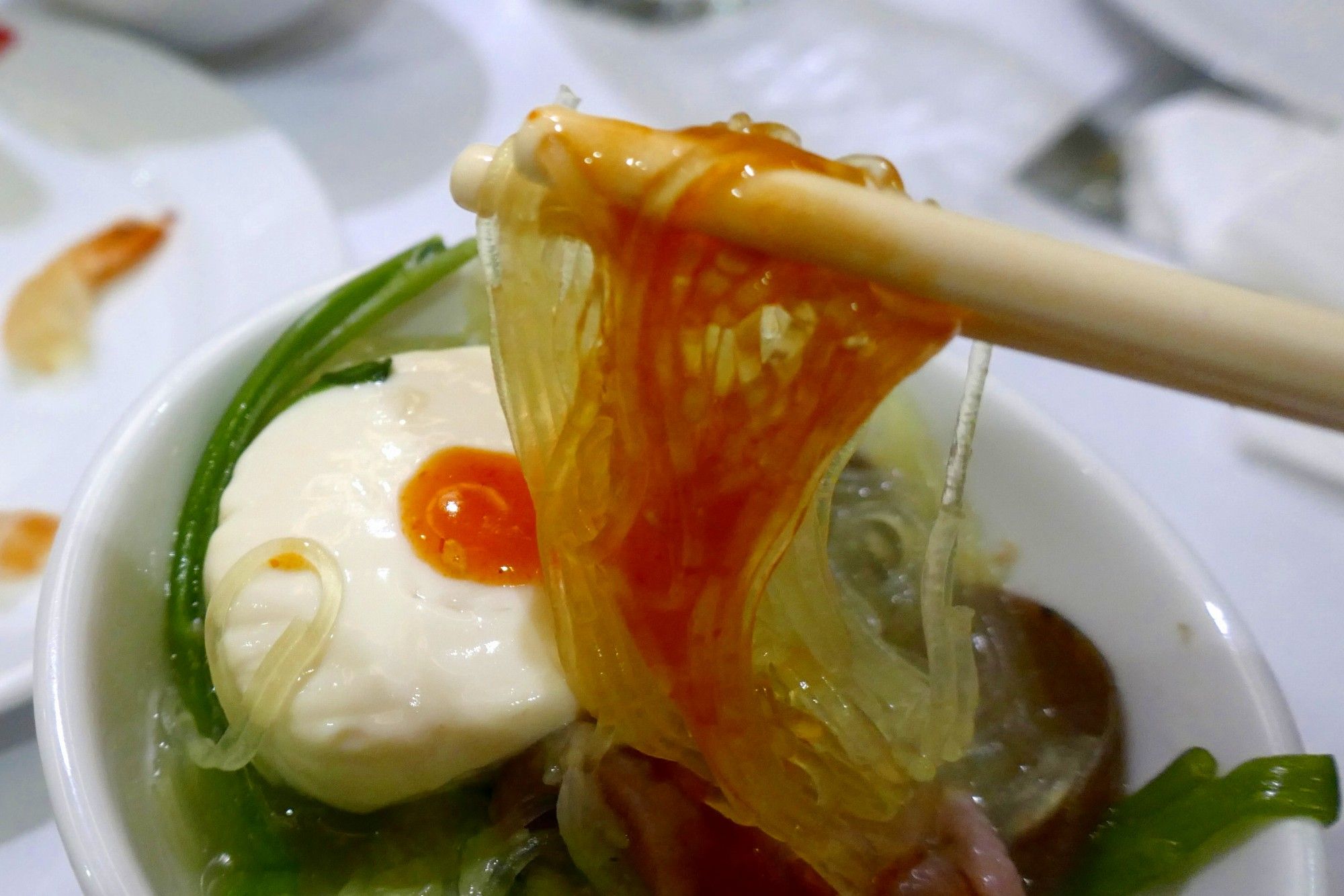 チリな辛さに満ちた赤いソースを掛けて、出汁の味が染みきった春雨をぺろり!