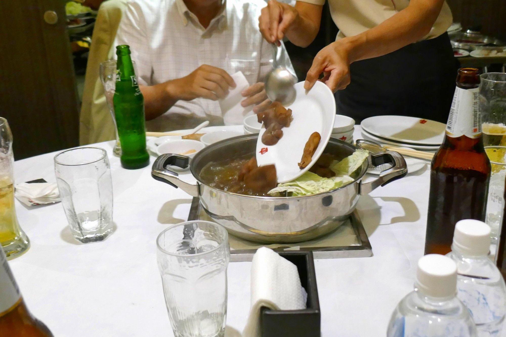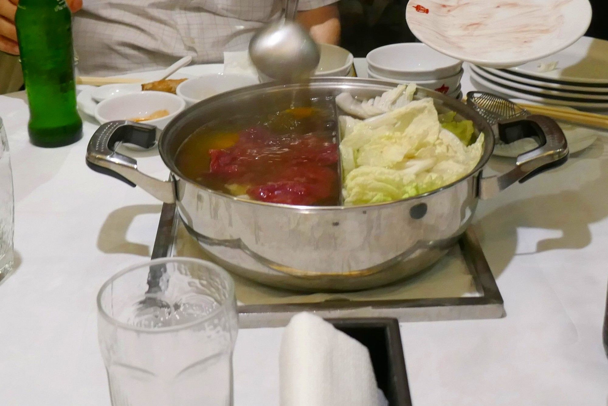 タイスキタイムがスタート!まずは、葉物野菜とお肉を鍋の中に投入!