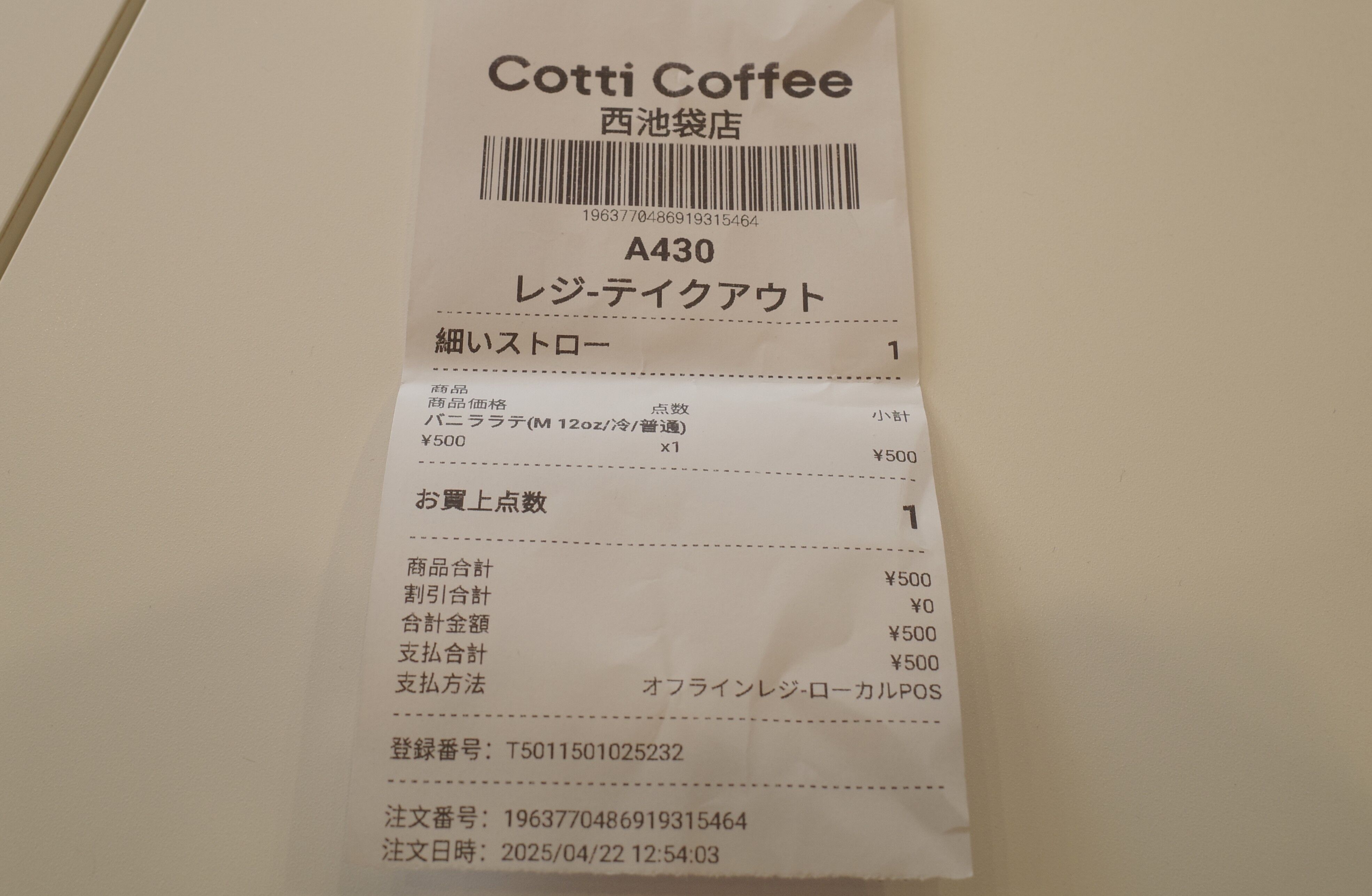 今回は「バニララテ(12oz)」500円をオーダー。