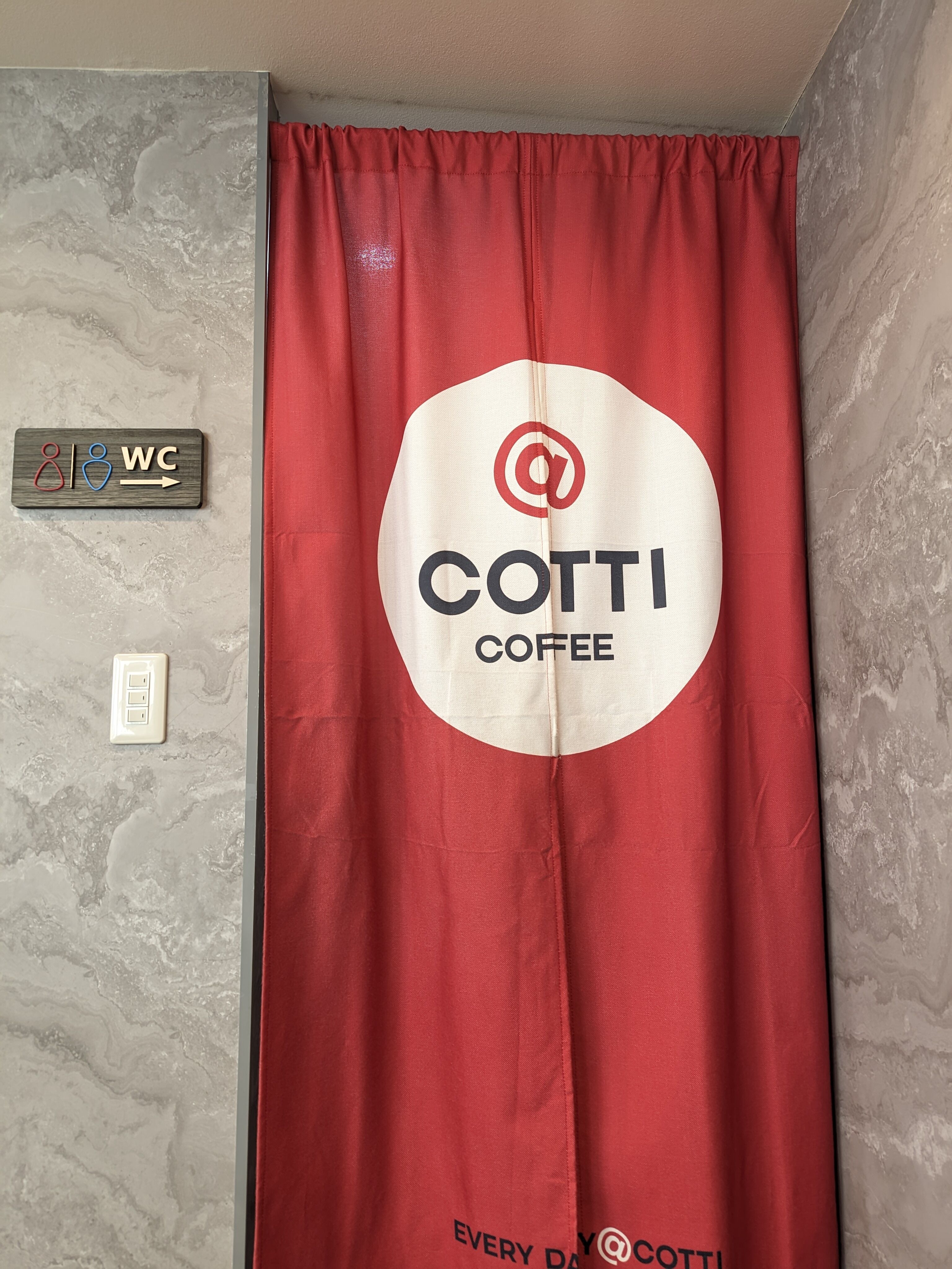トイレへと通じる通路には目隠し用にお店のロゴが入ったカーテンがセットされています。