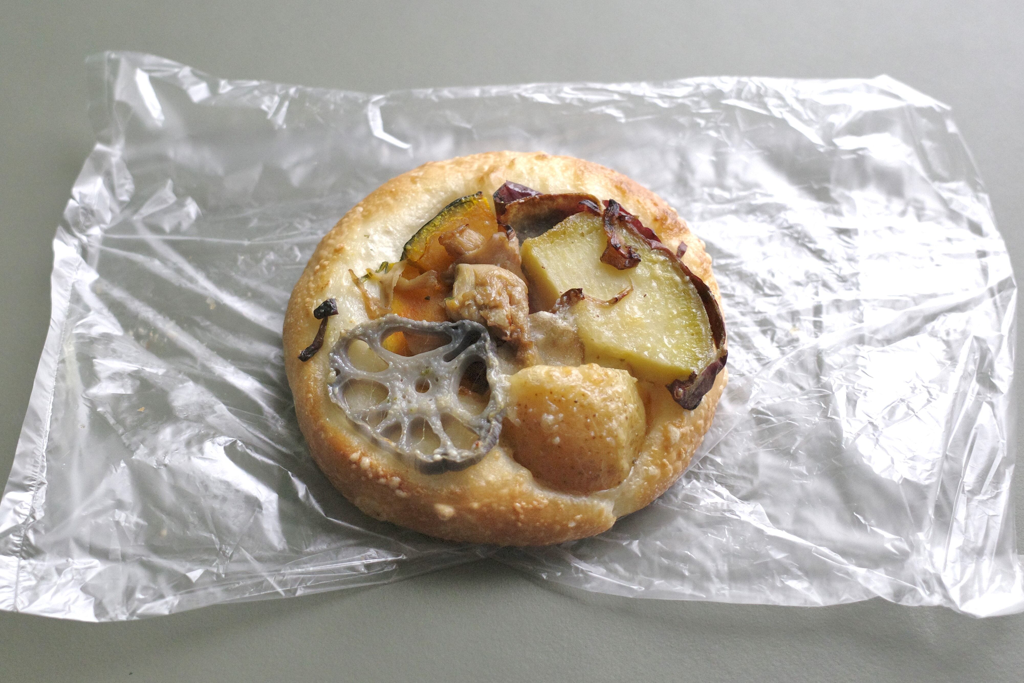 「根菜類のフォカッチャ」は、モッチリ食感のパンに塩気が立ったチーズ、甘味を帯びたさつまいも、しっとりとした舌触りのじゃがいも、カリカリとした歯ざわりのれんこん、旨味豊かなきのこ、燻した旨味に満ちたベーコン、甘味とコク強めなかぼちゃが入って味の良さ&お腹の満足度ともに高め!