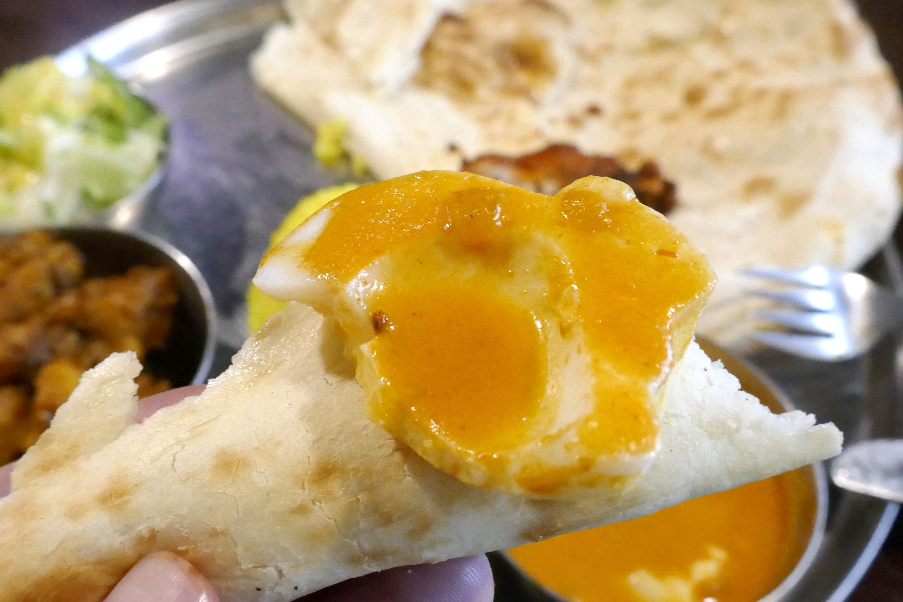 ナンはアツアツで甘みがあり、スパイスの風味がガツン!と効いていながらも甘味を帯びた「玉子マサラカレー」とマッチ!