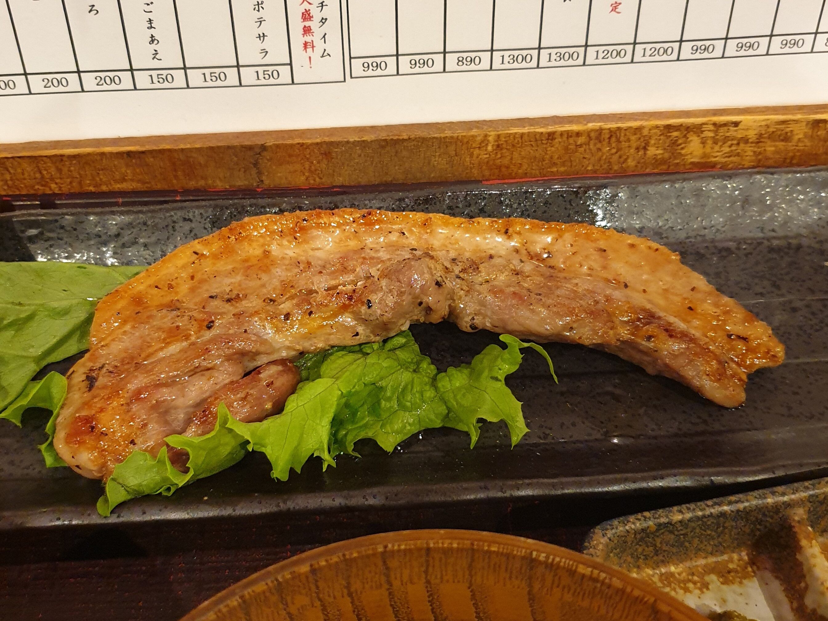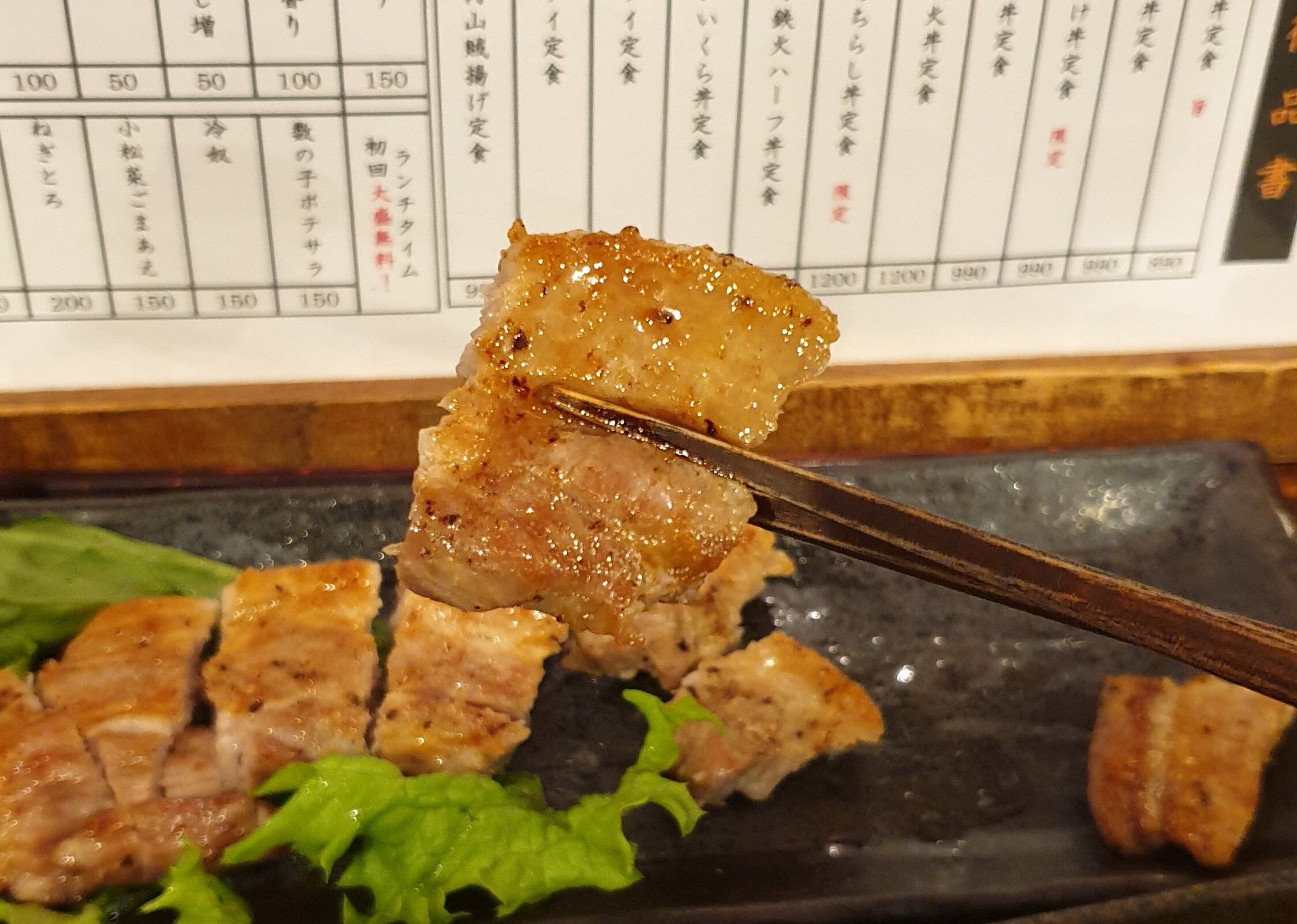 三元豚バラ黒胡椒焼きを一口大にカットして食べてみると、弾力に富んだ食感とお肉と脂身の旨味がビシバシ効いて中々のウマさ!ちなみに塩気は弱め!