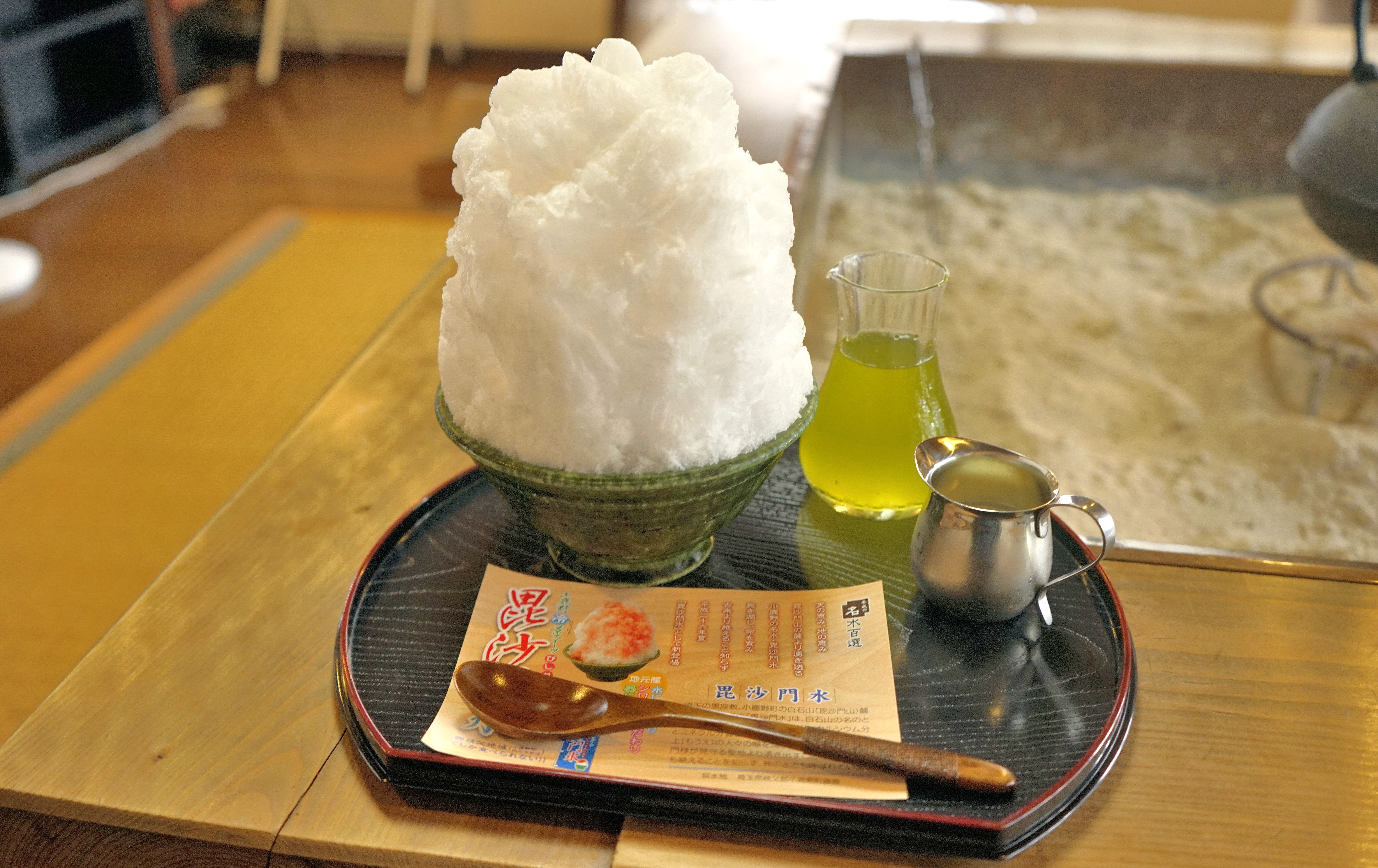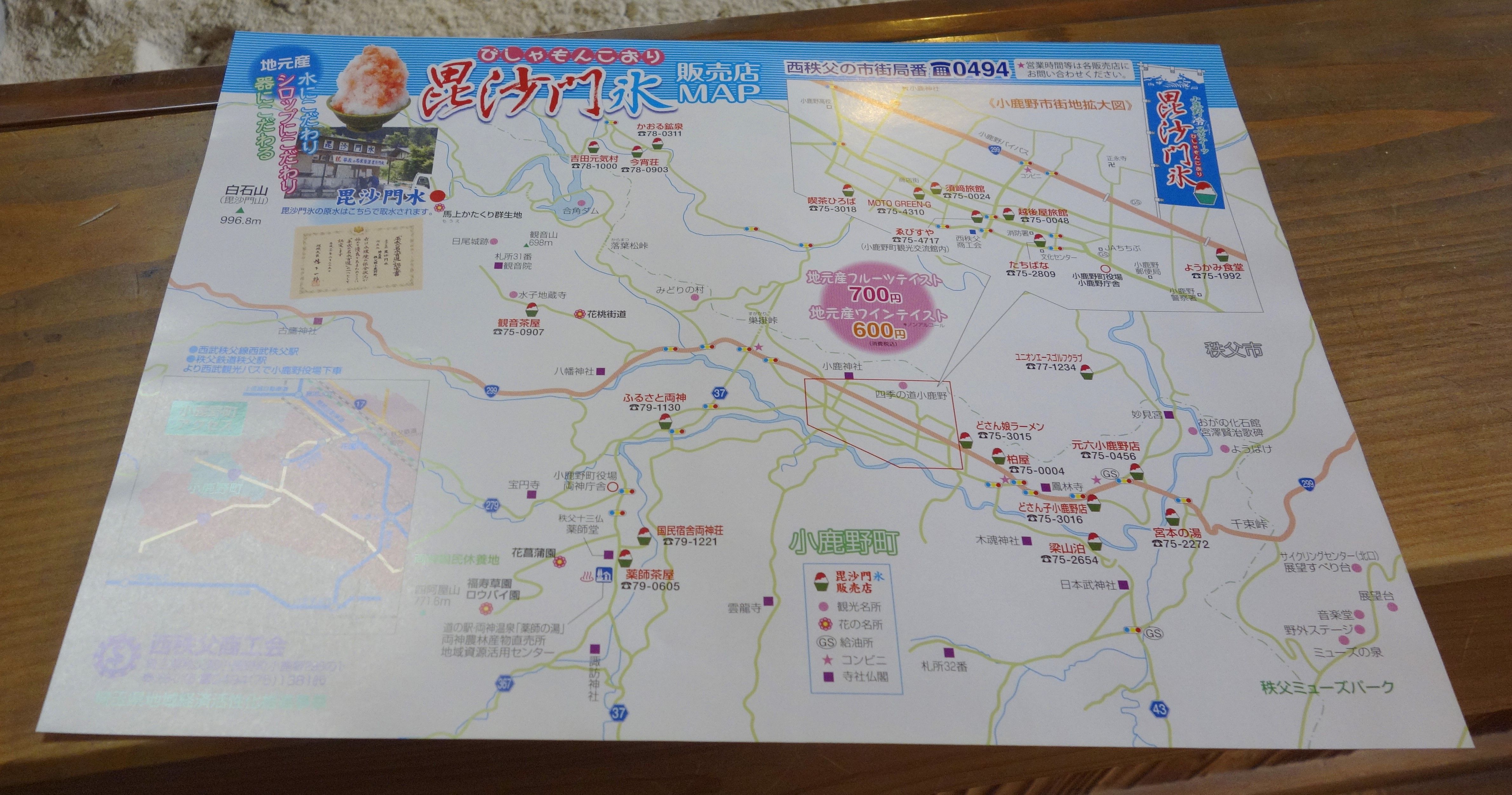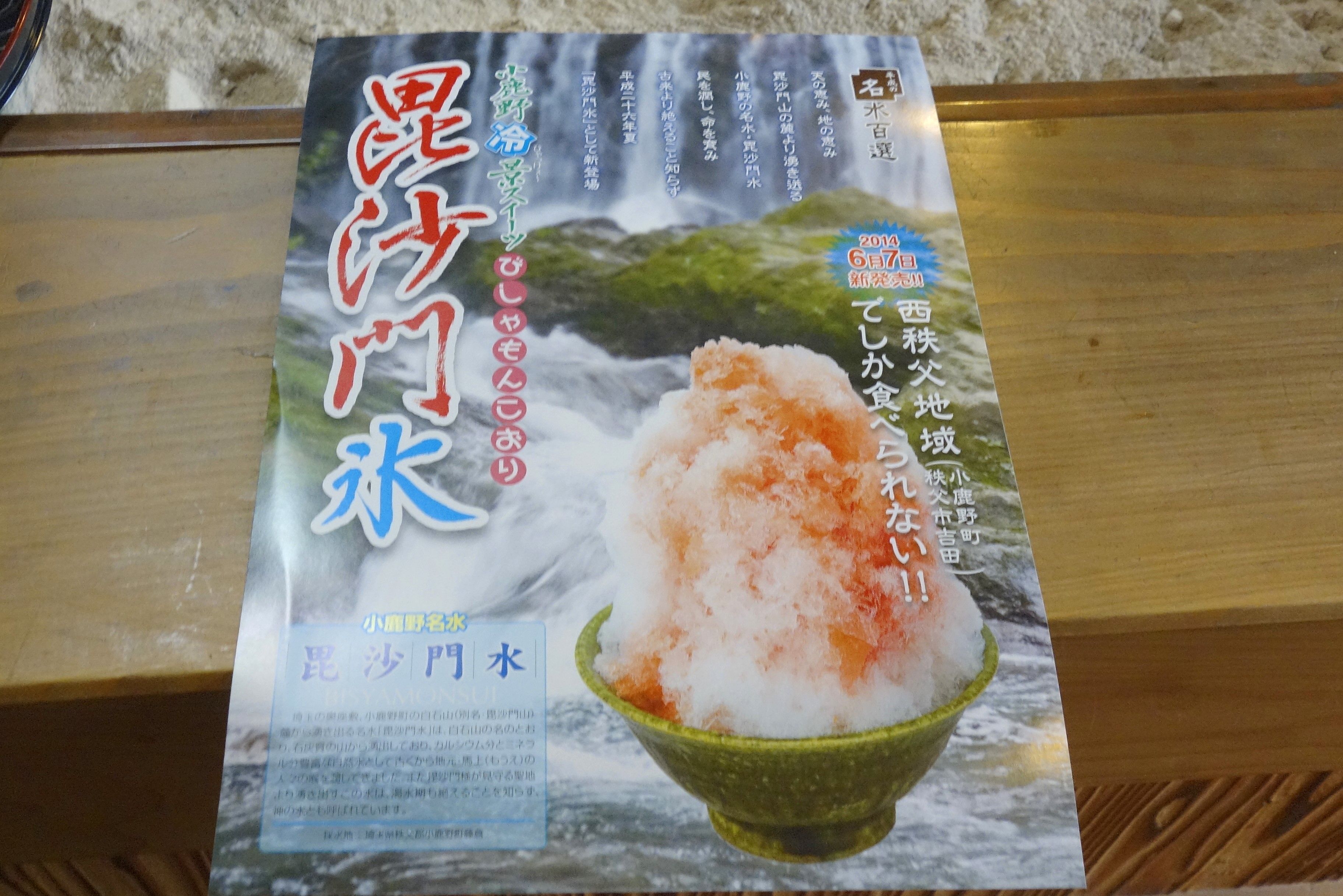 「毘沙門氷」とは小鹿野町が誇る「毘沙門水」から作った氷を削ったかき氷のことで、西秩父地域限定メニューとのこと。